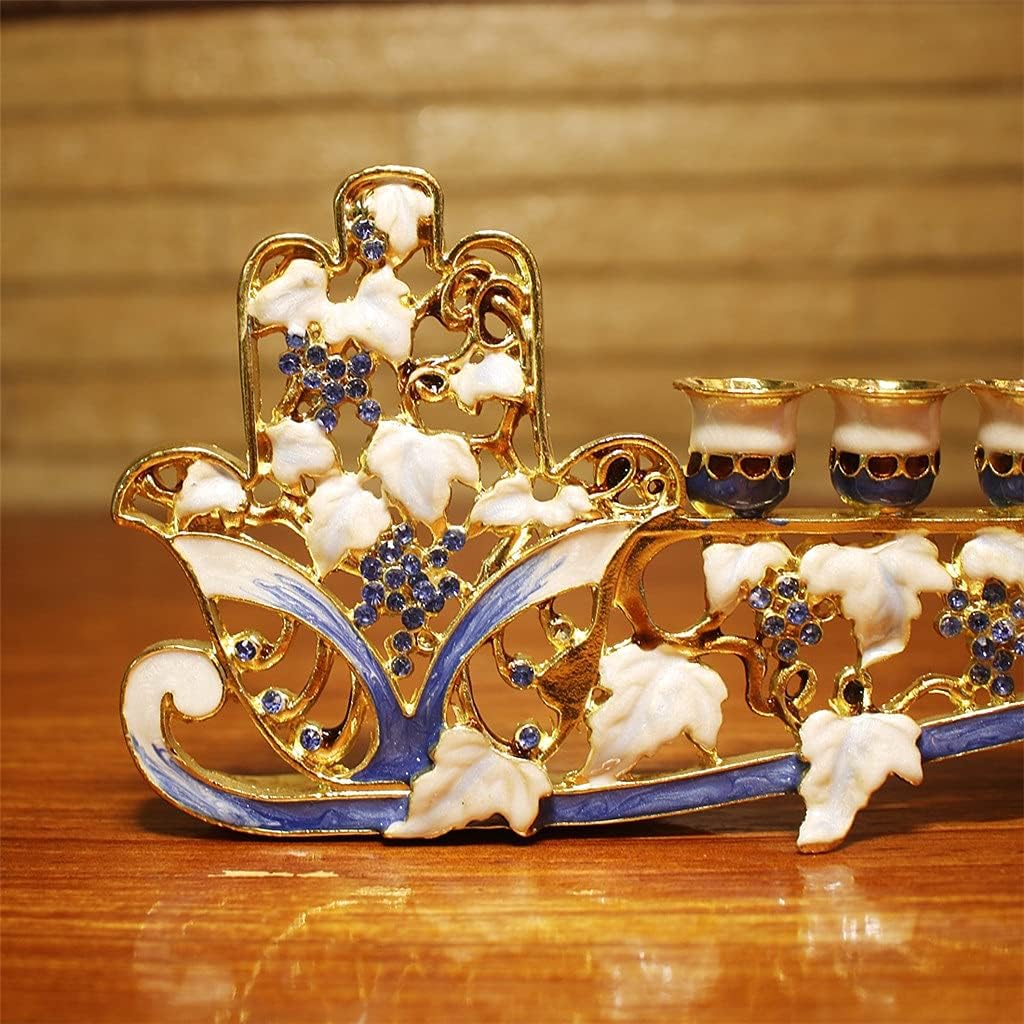 MATERIAL: Metal Alloy and hand enameled sparkling crystals. This nine branched Hand Painted Enameled candelabra with stable round base,stand sturdy and upright for safe use while keeping candles. This Menorah candle stick is a perfect embellishment to display on altar,shelf inside a cabinet,fireplace mantel,sideboard,prayer table or desk centerpiece. This's not only a Chanukiot Menorah or candelabra embellishment, but also a decent display decoration for your home,workplace, an ancient and vintage art collection, a meaningful holiday present,seeking to participate with celebration,hosting "Thanksgivikkah" in house,or starting to celebrate their religious activities,It's suitable for occasion like Canukah,The Feast of Dedication,dinner party,etc.Most importantly. Size:9*3.2 in, Cup size:12mm, Net Weight:276. Specification: Material: Metal Type: Pillar Holder Use: Religious Activities Metal Type: Alloy Package Includes: 1 Piece Menorah Candelabra Note: Please allow 1-3mm measuring deviation due to manual measurement. Due to the different monitor and light effect,the actual color of the item might be slightly different from the color showed on the pictures.Thank you! Generous and practical,clean and bright,for your home to add a modern factors.