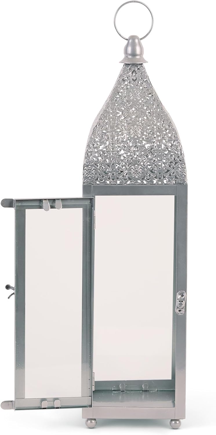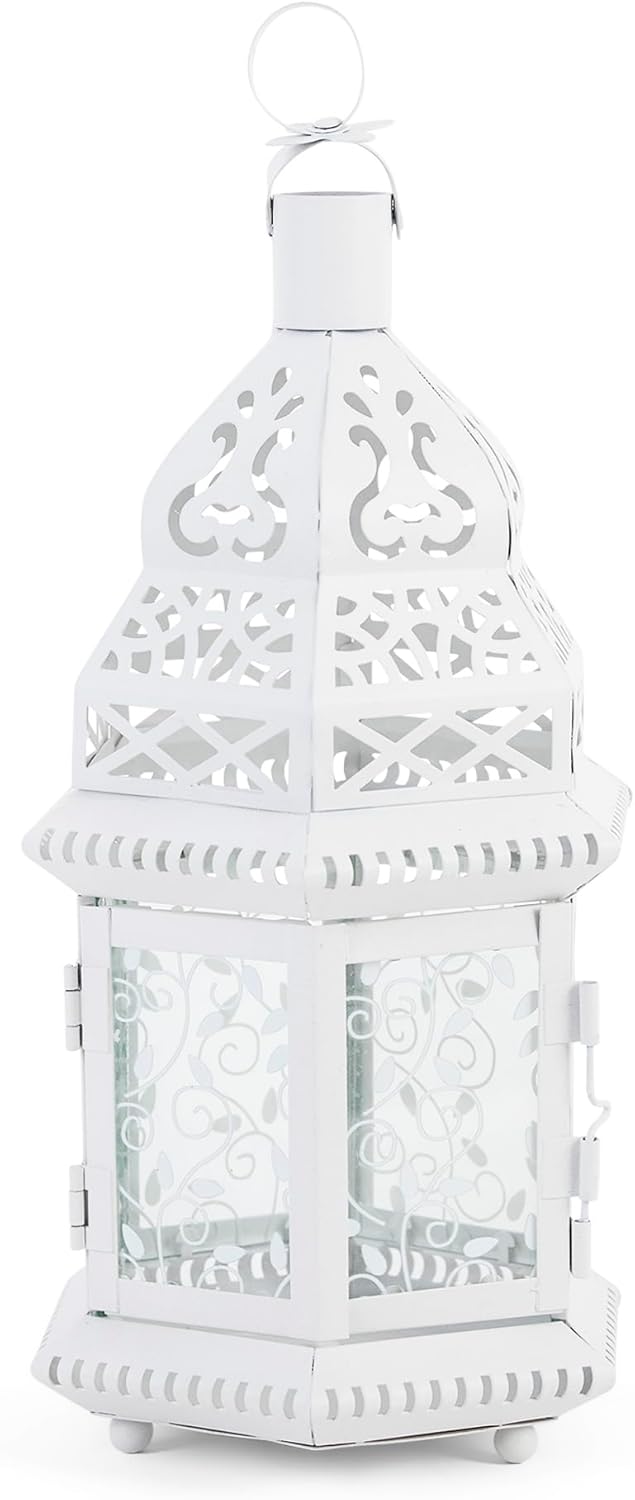 The combination of intricate metal cutouts and clear glass panes create a gorgeous effect of flickering light that can either set the tone for outdoor events or cast an exquisite glow on your tabletop. Hinged glass panels make it easy to place the candle or LED light of your choice and is ideal for festive parties, weddings, outdoor lighting or as gifts. Available in both large and small sizes as well as a variety of other designs and colors, find the Moroccan Style Lantern that best fits your home.