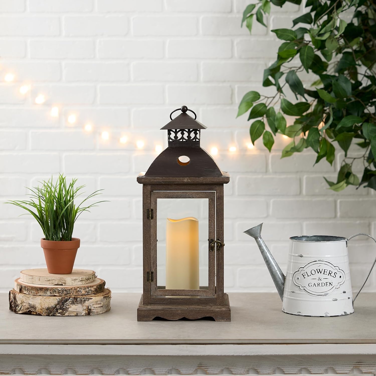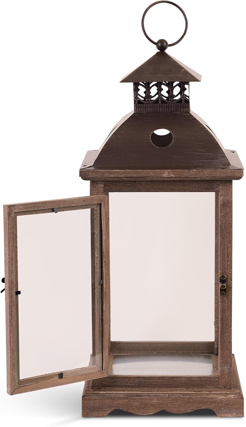 The stately design of this candle lantern will dress up your home, indoors or out. The wooden frame has a weathered finish and an antiqued latch on the hinged door makes it easy to insert the candle of your choice and enjoy the flickering glow. Topped with a decorative metal roof and hanging loop this piece is versatile and can serve as indoor ambience, wedding decor, or even the centerpiece of a table spread! Pairs well with the Small Monticello Lantern or as a gift by itself.