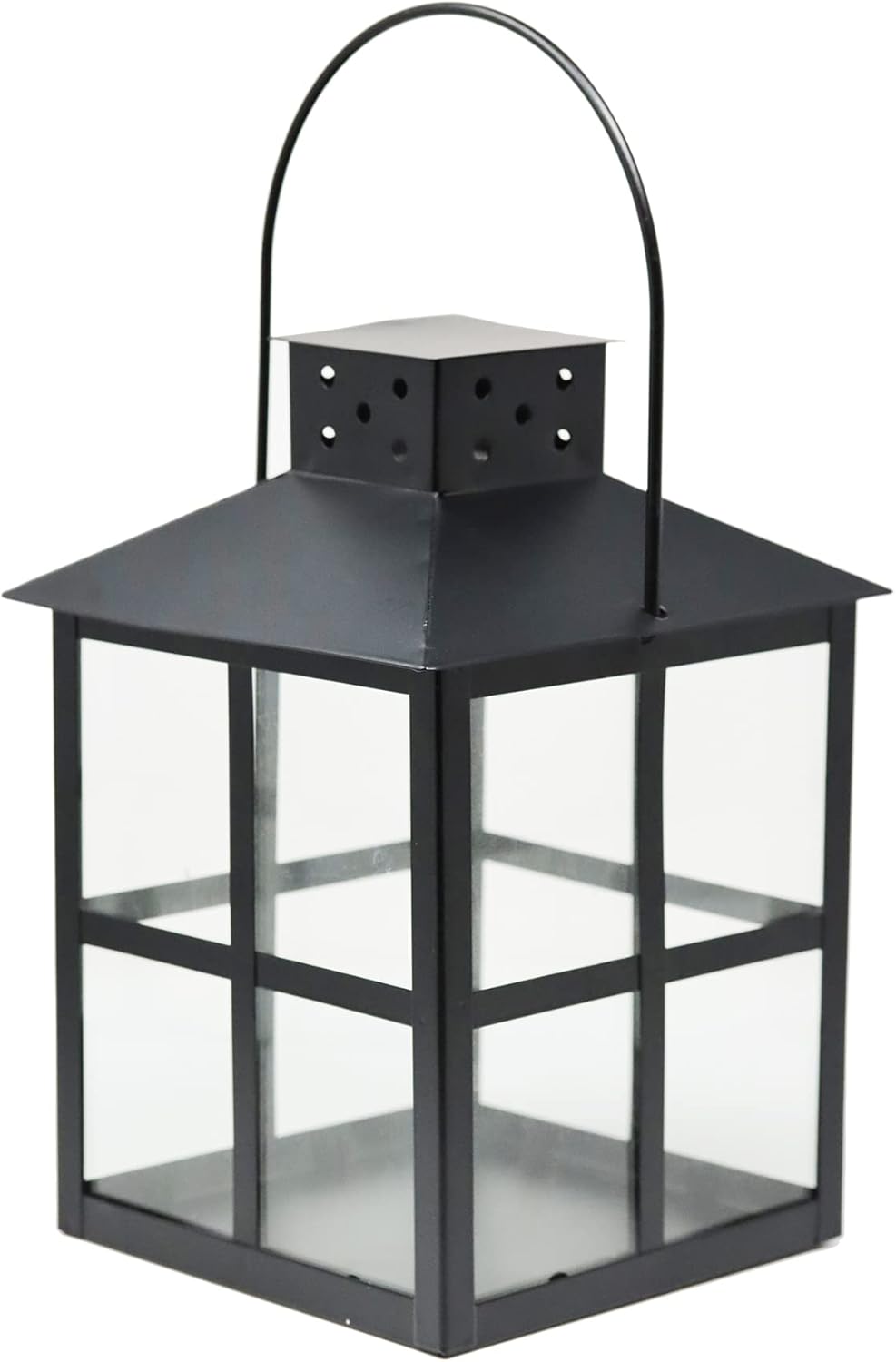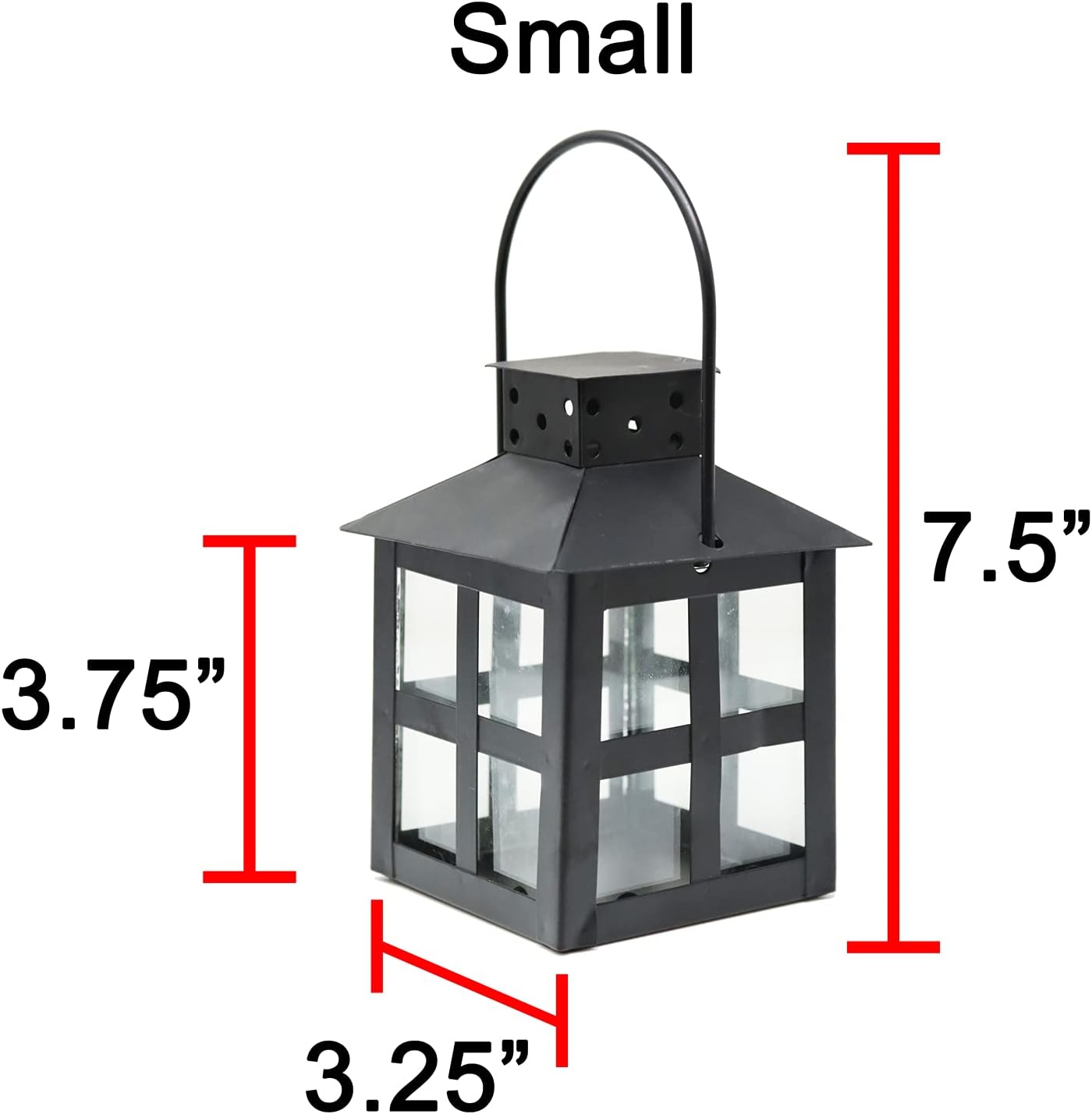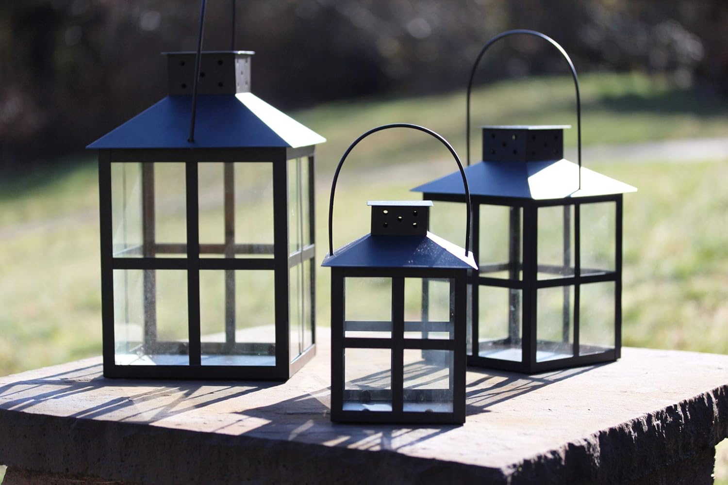 Set of 3 white square candle lantern set. Large: 5.5" x 6.75" high. 12" high with handle. Medium: 4.4" 5.25" high. 9.5" high with handle. Small: 3.25" x 3.75" high. 7.5" high with handle. Iron and glass.