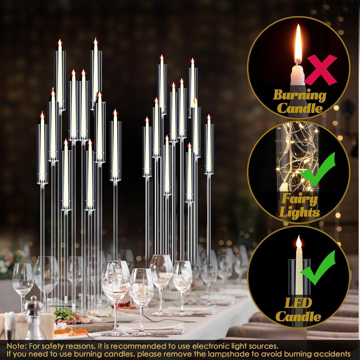 Features: Safe and Sturdy: The tall floor candle holders is made of durable acrylic, which is reliable and stable without shaking. Elegant and romantic: The delicate design of this clear candle holder makes it an ideal choice as a wedding table centerpiece, adding a touch of luxury and romance to your special day. Specifications: Size: 46.4'' x 16'' x 16'' Material: acrylic, Stainless steel Color: clear Package Included: 2 x Base 20 x Lampshade 20 x Acrylic pole 20 x Candle cup Warm notes: Manual measurement, please allow slight errors in size. The color may slightly differ due to different screen displays.