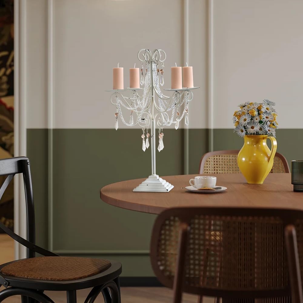 BOOMLATU 4-Arm Crystal Candelabra Taper Candlestick Candle Holder,Vintage Metal Candelabra Centerpieces Candle Holder for Tables Decoration,Fits 3.5Inch- Thick Candles Feature: Enhance your space with our stunning candelabra. Made from high-quality materials, these candelabra are durable and easy to care for. Their sleek design fits well with any decor, creating a warm and inviting atmosphere for any occasion. Handmade crystal beaded candlestick holders , with your own DIY design with candles or flowers, these warm, glowing decorations offer elegance, allure, and beauty to any table,or dinning room. Illuminate your space with the elegant glow of candelabra, enhancing the overall atmosphere. Ideal for modern and vintage, it is suitable for dining tables, weddings, and more. No matter your theme, style, or scheme, with this shinning and sparkling crystal candle holders,it will be the favorite candle ideas for reception centerpieces. 5 Arm Light Candelabra Features Color:white&pink/black&green crystal candle holders Size:19.2 Inches Tall Material:Decorative metal and Crystal Dimensions:19.2 Height, 11.8" in length,3.5" in candlestick tray diameter Warmly Notice 1.Clean with a soft, dry cloth. 2. For use with a tealight or flameless candle. 3. Please beware of fire & candle safety rules. Otherwise we recommend flameless candle. 4. Handcrafted-slight variation in shape.