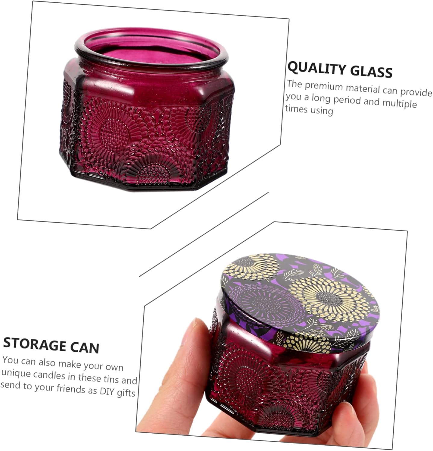 Package Include 14 x candle cups Features - Material: Glass candle container. - Size: 6.50X6.50X5.00cm/ 2.55X2.55X1.97inch storage can. - After the candle is gone, the jar can also be used to storage craft projects and other small items DIY candle tin. - Comes with 14pcs, it is convenience and sufficient for beginners, craft lovers, candle lovers and so on glass candle container. - Fulling of beautiful embossed patterns, our glass candle tin jars are great birthday and anniversary your friends, families, , and candle making lovers. candle can - These bulk candle jars for making candles are great storage items that are both practical and beautiful. Place them on your coffee table, your vanity or anywhere that needs a of colour candle making tin. - Light the candle, when the flame illuminates the delicate relief, the beautiful hues flashes storage container.Goods Informationcandle storage jar The candle jar adopts material, you can use it for a long time.storage container Besides, they're or packages for your friends.storage can Apart from being used as candle making containers, our reusable glass candle jars with lids can be used for sugar, coffee bean, , beeswax, tea, coins, as well as other crafts storage