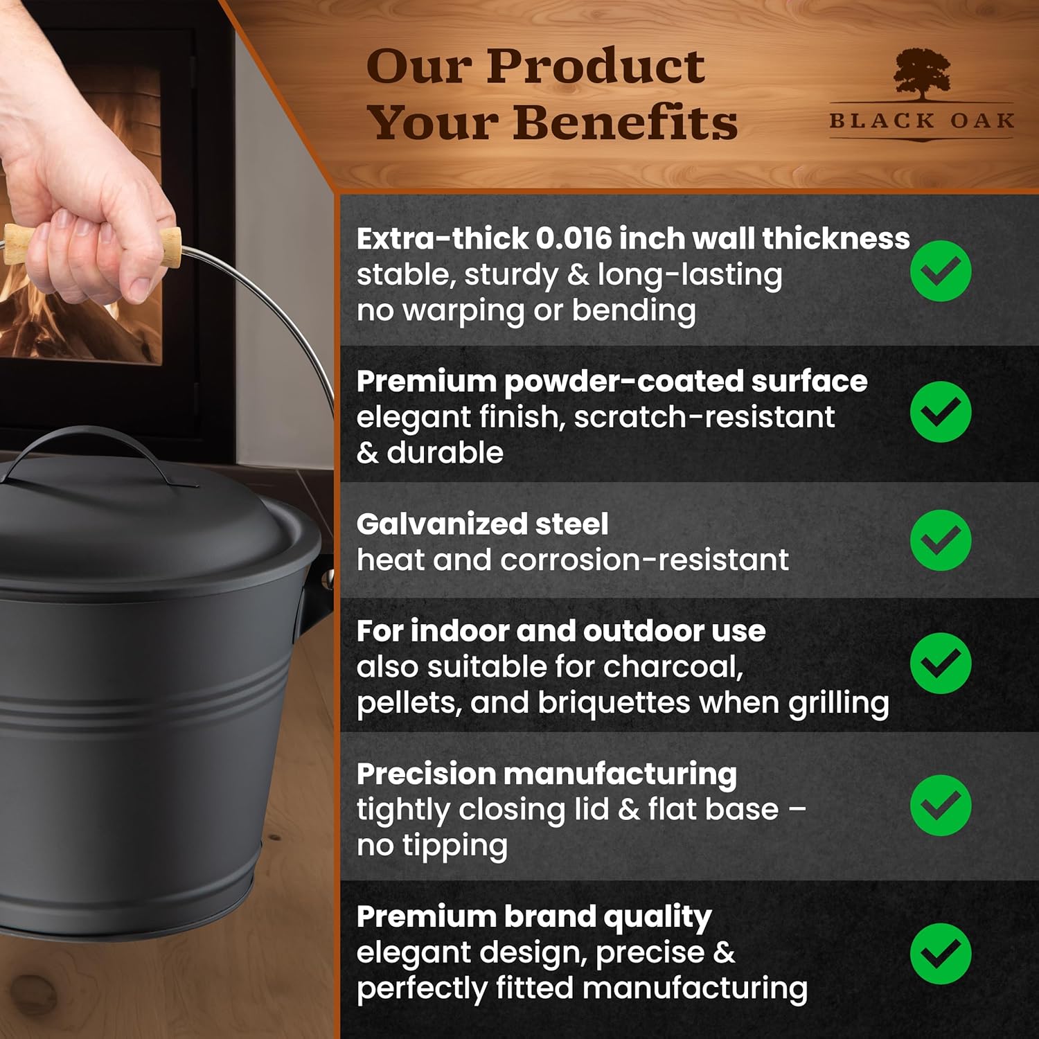 Stylish accessories for fireplaces and fireplace areas The BLACK OAK PITON 1.5 GAL ash bucket combines subtle design with practical functionality. With its matte black surface and light wood handle, it blends harmoniously into both modern and classic living spaces โ an elegant companion for fireplaces, stoves, barbecues, and fireplace areas. Compact, modern, and versatile With a volume of 5 liters, the PITON is ideal for anyone looking for a space-saving solution. It is perfect for collecting and transporting ash, cooled ash residues, or fireplace residues, and its minimalist design gives it a timeless appearance that charmingly combines order and style. Easy to fill and secure to close The 8.5 inch opening makes filling easy, while the precisely fitting lid with metal handle closes securely and keeps dust out. This keeps your surroundings clean โ whether you are removing leftovers after use or preparing for cleaning after barbecuing. Comfortable to carry in everyday use The painted wooden handle on the sturdy metal bracket feels pleasantly warm in the hand and ensures a secure grip. Its ergonomic shape makes it comfortable to carry, even when full. The lid provides reliable protection against escaping ashes. Durable and heat-resistant Made of galvanized, black powder-coated steel, the PITON impresses with its strength and dimensional stability. The 0.016 inch thick wall protects against deformation, remains rust-free, and retains its elegant appearance. A raised base protects sensitive surfaces โ even when the ashes are still warm. BLACK OAK โ quality that inspires Manufactured with attention to detail, the PITON 1.5 GAL stands for practical elegance and reliable workmanship. It makes cleaning your fireplace or grill a pleasant, clean ritual and brings stylish order to any living space.