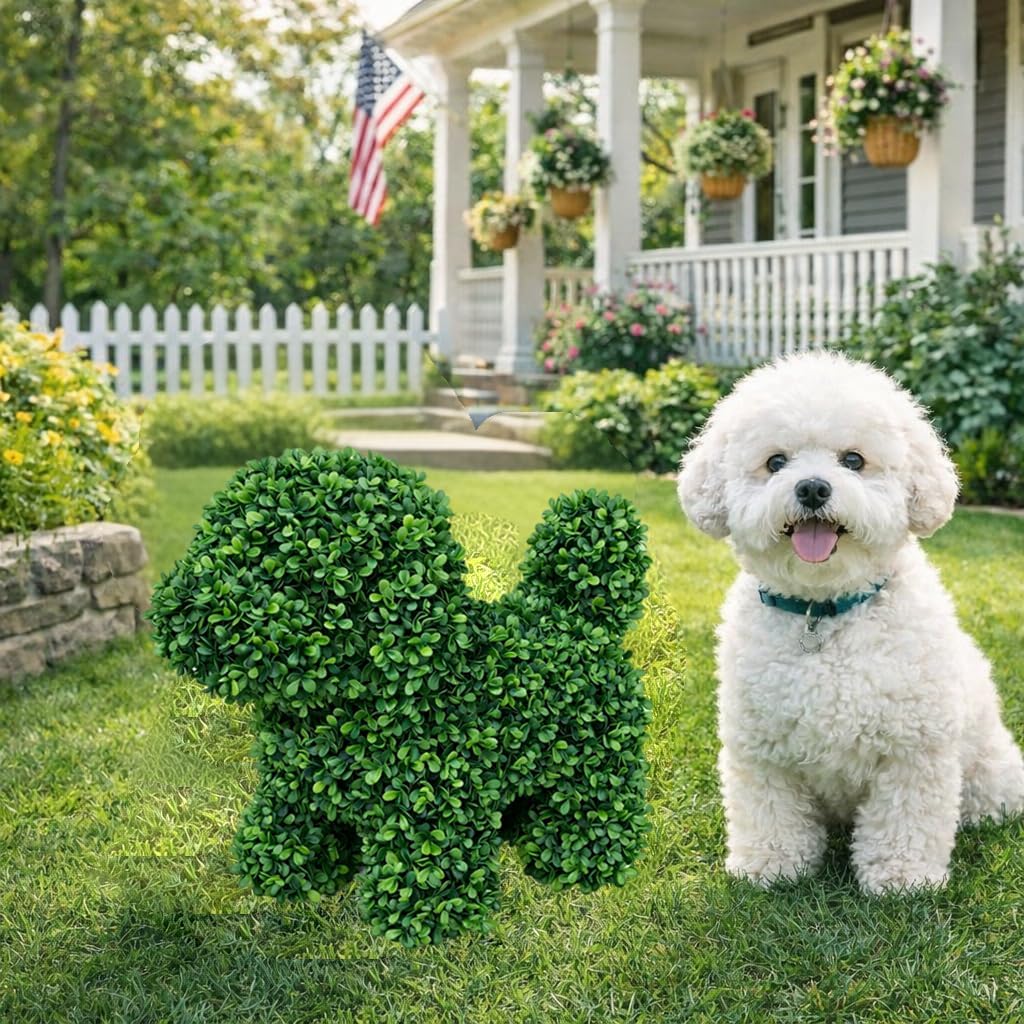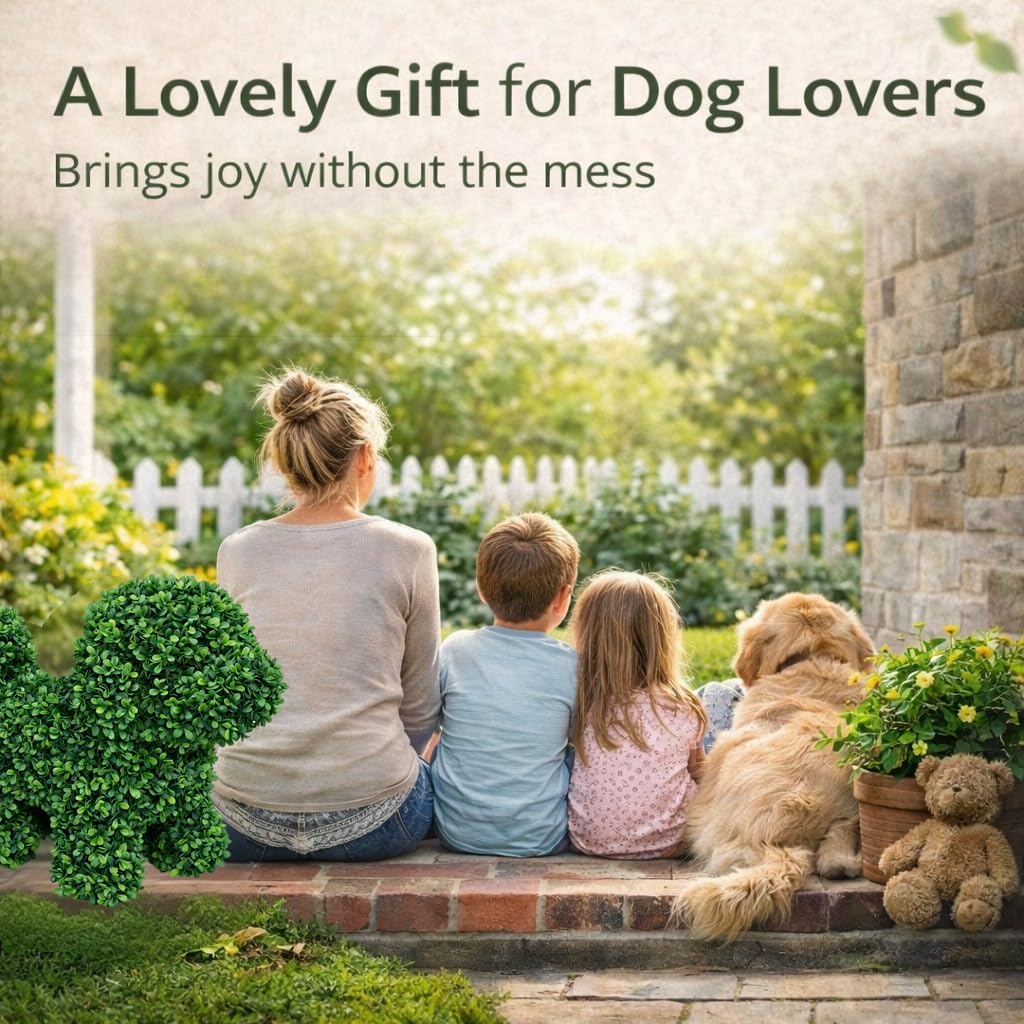 [Meet Lucky: Your Loyal Green Companion] I’m Lucky, a little green pup with a heart of gold. Unlike real dogs, I don’t bark or shed, but I’ll always be waiting by the door to welcome you home with a splash of everlasting life. I’m here to add a touch of warmth and joy to your space every single day. [Always Fresh, Zero Maintenance] Lucky stays perfectly groomed without any shears! No watering, no feeding, and no sunlight required. She is the perfect "pet" for busy plant lovers, providing the lush look of a real boxwood topiary without the high-maintenance upkeep. [Weatherproof & UV Resistant] Designed to soak up the sun just like a real puppy, Lucky is treated with a professional UV-resistant coating. Whether placed on a sunny porch or a rainy garden path, her dense green foliage won't fade or wither, maintaining her vibrant look through all seasons. [Lifelike Texture & Sturdy Build] Crafted with high-density, eco-friendly PE leaves, Lucky feels as full and lush as a natural shrub. Her internal structure is reinforced for stability, ensuring she stays standing tall as a charming guardian of your entryway or living room. [The Perfect Gift for Dog Lovers] Searching for a unique gift? Lucky is a heartwarming choice for dog owners, housewarmings, or birthday surprises. She brings a "green soul" to any home, offering a silent, beautiful friendship that lasts a lifetime.