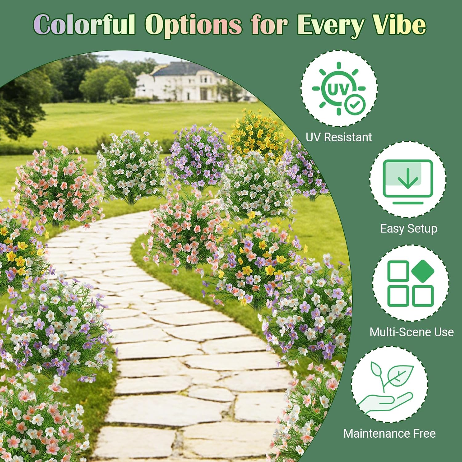 A Perfect Sphere of Enduring Blooms: 1. Embrace the perfectly rounded, lush silhouette of a densely packed floral sphere, available in 7 vibrant color varieties. 2. A complete set of 2 allows for balanced placement on either side of a doorway, along a path, or in paired planters. 3. Built with premium UV and weather-resistant materials for year-round outdoor enjoyment. 4. Features a realistic green short trunk and a practical, elongated ground spike for incredibly quick and secure installation. 5. Exceptionally versatile for enhancing gardens, patios, porches, indoor spaces, and special events. 6. The ultimate maintenance-free gift, delivering perpetual beauty and joy. Specifications: Product Name: 2 Pack Artificial Floral Sphere Shrubs Color Options: Yellow/Purple/White/Pink/Multicolor/Pink White/Purple White Material: Plastic & Silk Flowers Sphere Diameter: 15.7 inches (approx. 40 cm) Overall Height: 23.6 inches (approx. 60 cm) Product Weight: 1.82 lbs (approx. 0.83 kg) Applicable Scenarios: Porch, Garden, Doorway, Living Room, Indoor Decor, Outdoor Decor. Decoration Suggestion: You can directly insert the fake flowers into the lawn or into the bushes to make them look real and realistic from a distance. You can also place faux flowers in various vases or baskets and use them to decorate your corridors, doors, balconies, gardens, and more. Use your imagination to make your home more beautiful. Package Includes: 2 x Artificial Floral Sphere Shrubs Kind Reminder: Please read before purchasing 1. A temporary plastic odor may occur after shipping; simply air outdoors for a short time to refresh. 2. Leaves or blooms may loosen during transit; a gentle fluffing by hand will restore their natural fullness. 3. Though UV-resistant, prolonged intense sun may gradually affect color over many seasons. After-sales Service: If you have any questions about artificial plants, please feel free to contact us. We will reply and solve your problems within 24 hours. Wishing you a wonderful day!