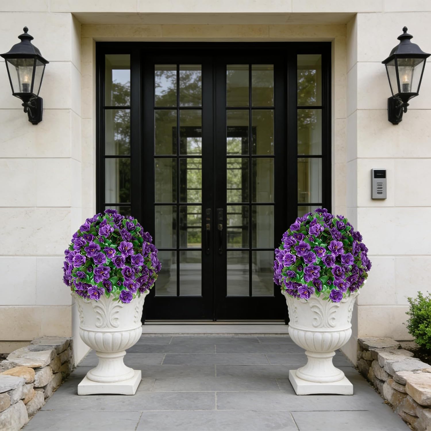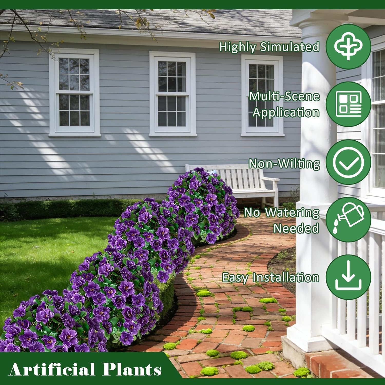 A Permanent Bloom, Unfolding in Vibrant Colors: 1. Ultra-realistic spherical topiary with vibrant, densely packed rhododendron blooms in four charming colors. 2. Crafted from high-quality, UV-resistant materials for all-weather outdoor use without fading. 3. Effortless tool-free installation with a sturdy ground spike for instant placement in soil or planters. 4. Versatile decor perfect for gardens, patios, front porches, and indoor living spaces. 5. Offers 100% maintenance-free beauty, eliminating all watering, pruning, and cleaning worries. 6. An ideal and thoughtful gift that brings lasting joy, perfect for housewarmings or garden lovers. Specifications: Product Name: Artificial Rhododendron Shrub with Ground Spike Color Options: Yellow/Purple/Pink/Orange Material: Plastic & Silk Flowers Topiary Ball Diameter: 13.8 inches (approx. 35 cm) Overall Height: 19.7 inches (approx. 50 cm) Product Weight: 1.34 lbs (approx. 0.607 kg) Applicable Scenarios: Porch, Garden, Doorway, Living Room, Indoor Decor, Outdoor Decor. Decoration Suggestion: You can directly insert the fake flowers into the lawn or into the bushes to make them look real and realistic from a distance. You can also place faux flowers in various vases or baskets and use them to decorate your corridors, doors, balconies, gardens, and more. Use your imagination to make your home more beautiful. Package Includes: 2 x Artificial Rhododendron Shrub with Ground Spike Kind Reminder: Please read before purchasing 1. A temporary plastic odor may occur after shipping; simply air outdoors for a short time to refresh. 2. Leaves or blooms may loosen during transit; a gentle fluffing by hand will restore their natural fullness. 3. Though UV-resistant, prolonged intense sun may gradually affect color over many seasons. After-sales Service: If you have any questions about artificial plants, please feel free to contact us. We will reply and solve your problems within 24 hours. Wishing you a wonderful day!