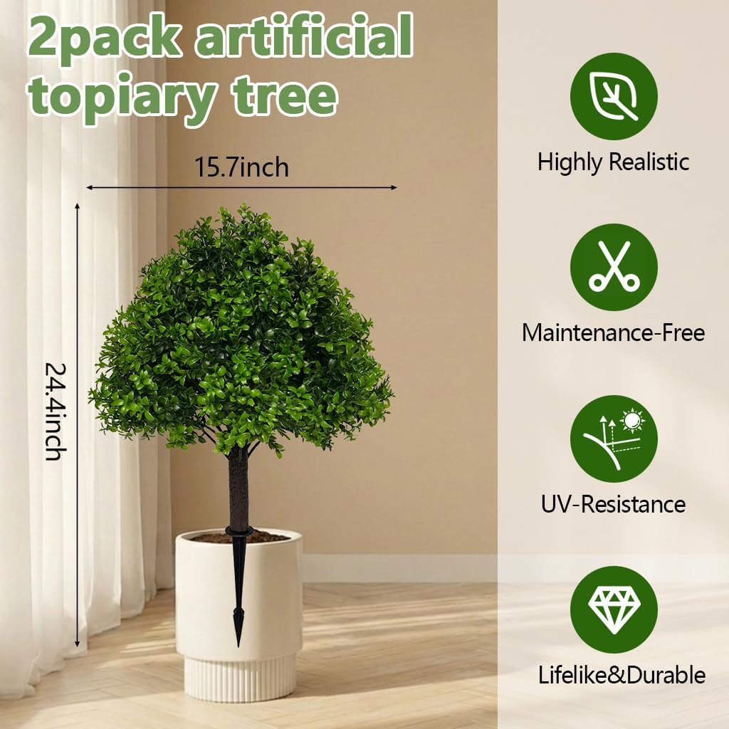 Paistao 24.5" Artificial Boxwood Topiary Ball Trees with Ground Spike, Set of 2 UV Resistant Faux Shrubs for Outdoor Indoor Porch Garden Planter Decor