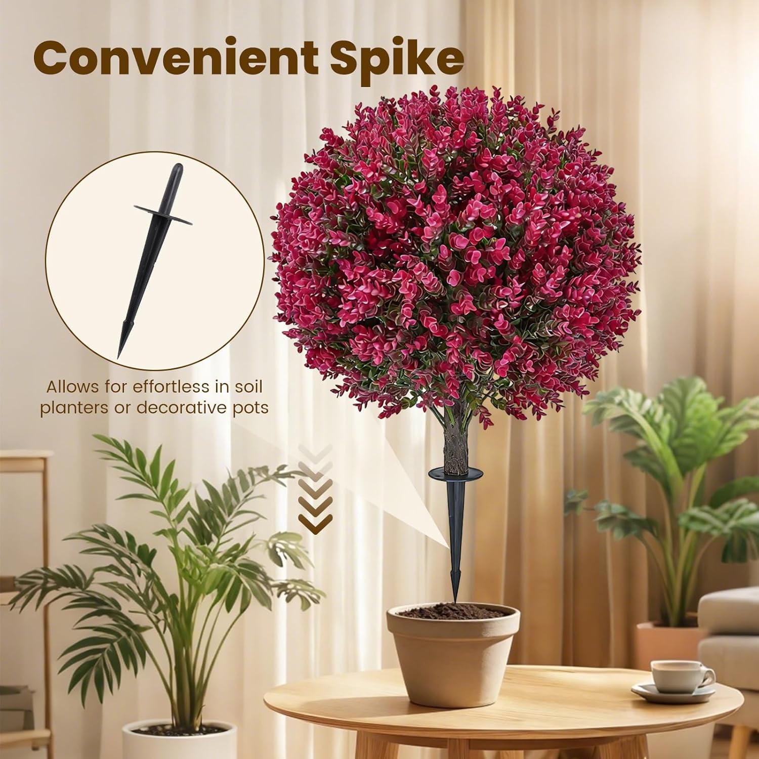 This set of 2 artificial red eucalyptus topiary trees with ground stakes combines realistic red foliage with durable weather-resistant performance, making it an ideal decor for multiple scenes. Featuring a classic spherical shape, it restores the vivid color and leaf texture of natural eucalyptus, presenting a lifelike and elegant appearance. Made of premium UV-resistant and waterproof material, these fake eucalyptus shrubs resist fading and weather damage, maintaining vibrant color all year. Equipped with sturdy plastic stakes, installation is tool-free and quick—just insert into soil or planters. With zero maintenance required, these versatile red stake trees are perfect for patios, gardens, cemetery decor, and indoor spaces, bringing long-lasting beauty to any area.