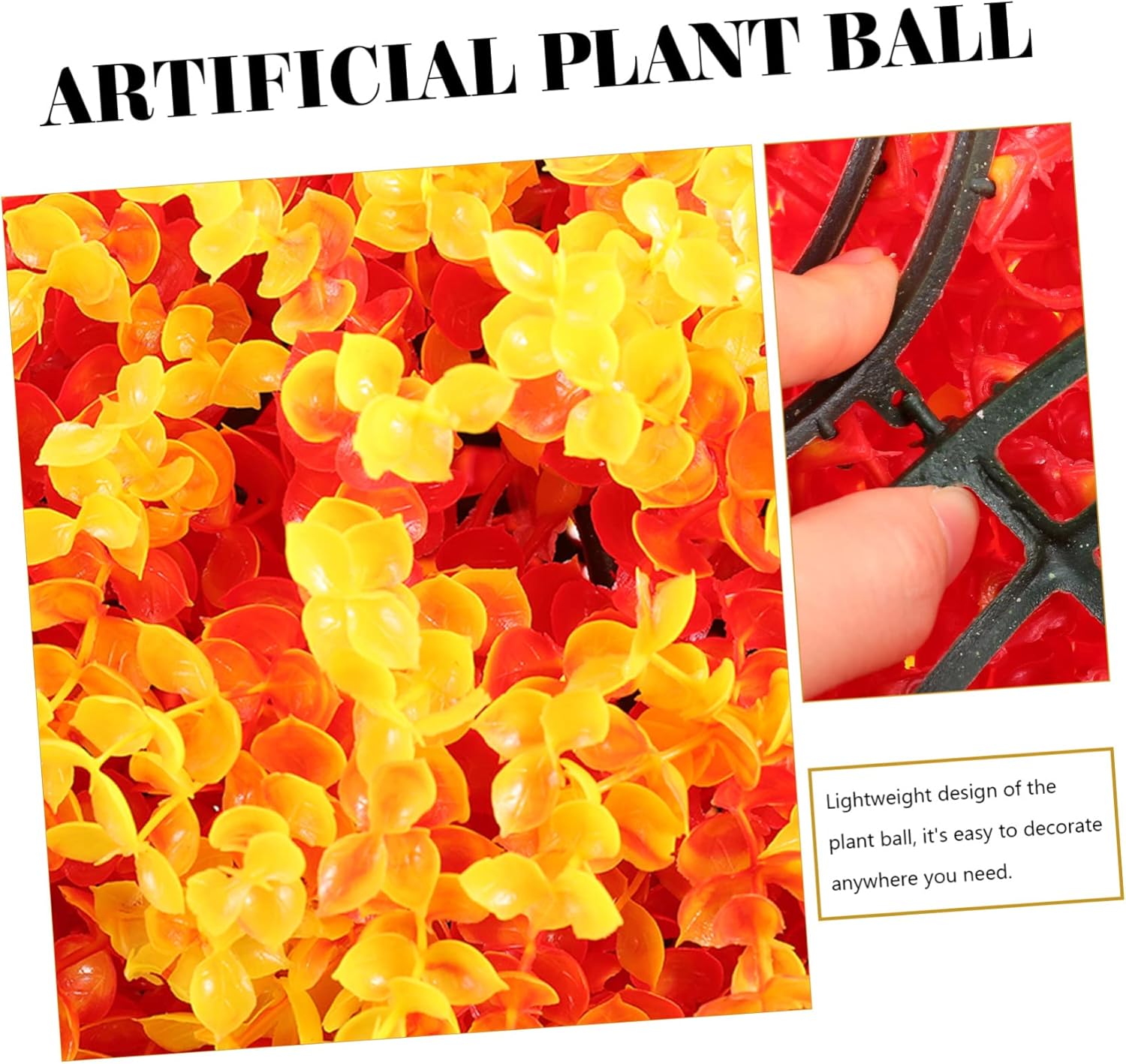 Package List 1 x hanging grass ball Characteristics -Material:Plastic grass sphere - Color: Orange artificial plants topiary balls -Product Info:Simulated Eucalyptus decorative grass balls - Size: 35.00X35.00X13.00cm/13.76X13.76X5.11in round topiary ball outdoor - You can put it in a large vase or a large bowl to bring a sense of nature into your home greenery ball outdoor - Also, can be hung on the tree, ceiling, wall, etc. Or, just placed on the garden, balcony, etc artificial plant topiary ball - Using plastic material with fine craftsmanship, make it look realistic and lifelike hanging plant ball - Easy to take care of, it is the perfect decoration for household party and wedding scene layout outdoor topiary ball - Attract the attention of guests and friends with its unique realistic and charm and style. hanging fake plant ballGoods Informationlarge topiary ball Suitable for decorating your garden.hanging fake plant ball Realistic shape and fine workmanship make it essential for landscape DIY landscaping.topiary balls flowers large Do you want to decorate your house with some plant balls? If so, our simulation plant ball is carefully prepared for you