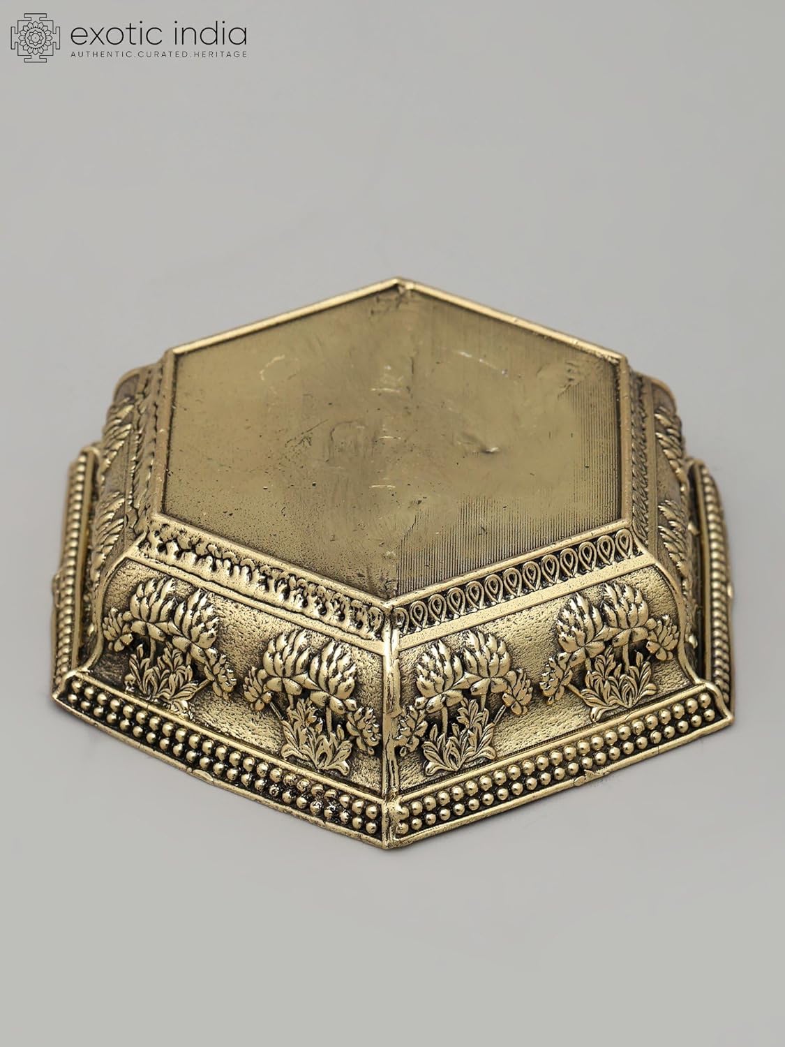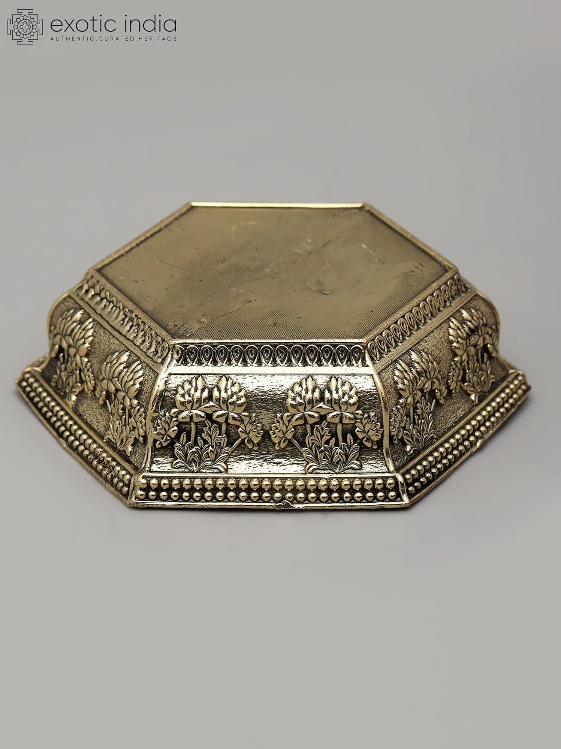 Exotic India Art Pvt. Ltd. The pedestal is adorned with intricately embossed lotus designs. The lotus flower holds profound symbolic meaning in many Eastern religions and cultures, particularly Hinduism and Buddhism. Emerging from murky waters, the lotus blossoms into exquisite beauty, symbolizing purity, enlightenment, rebirth, and transcendence. The unfolding petals represent the expansion of the soul and the journey towards spiritual awakening. In Hindu mythology, many deities are depicted seated upon lotus thrones, symbolizing their divine status and their connection to purity and spiritual wisdom. Lakshmi, the goddess of prosperity and good fortune, is often associated with the lotus, as is Brahma, the creator god, who is believed to have emerged from a lotus that sprouted from Vishnu's navel.
