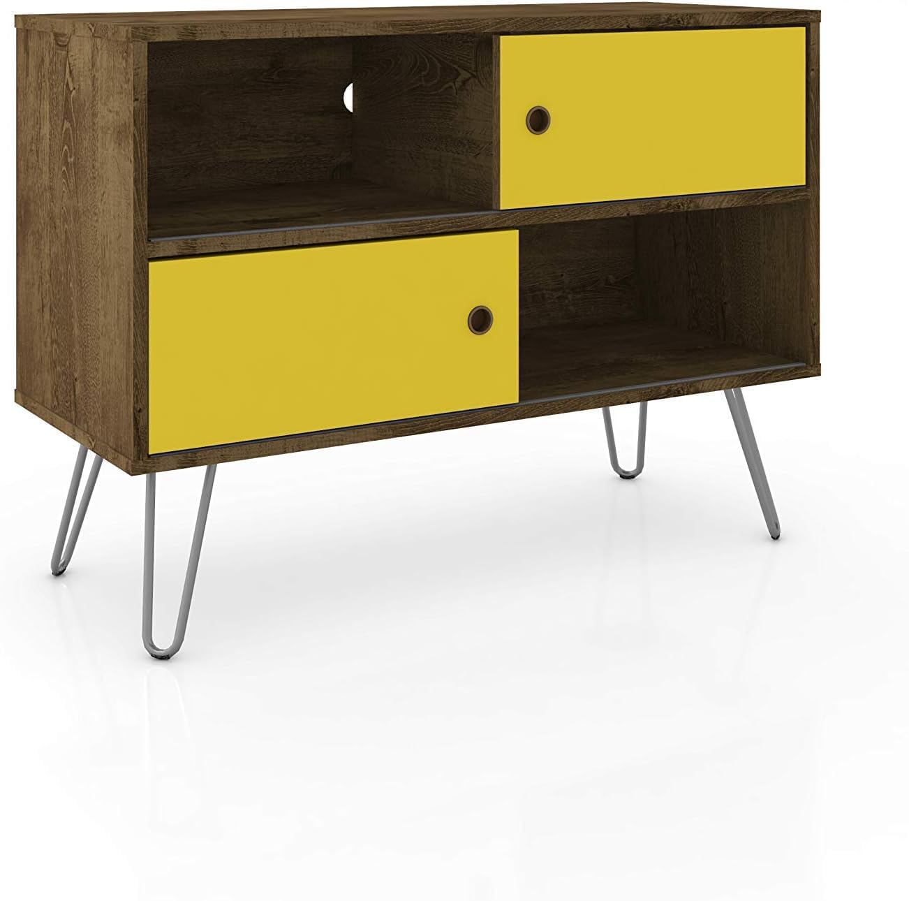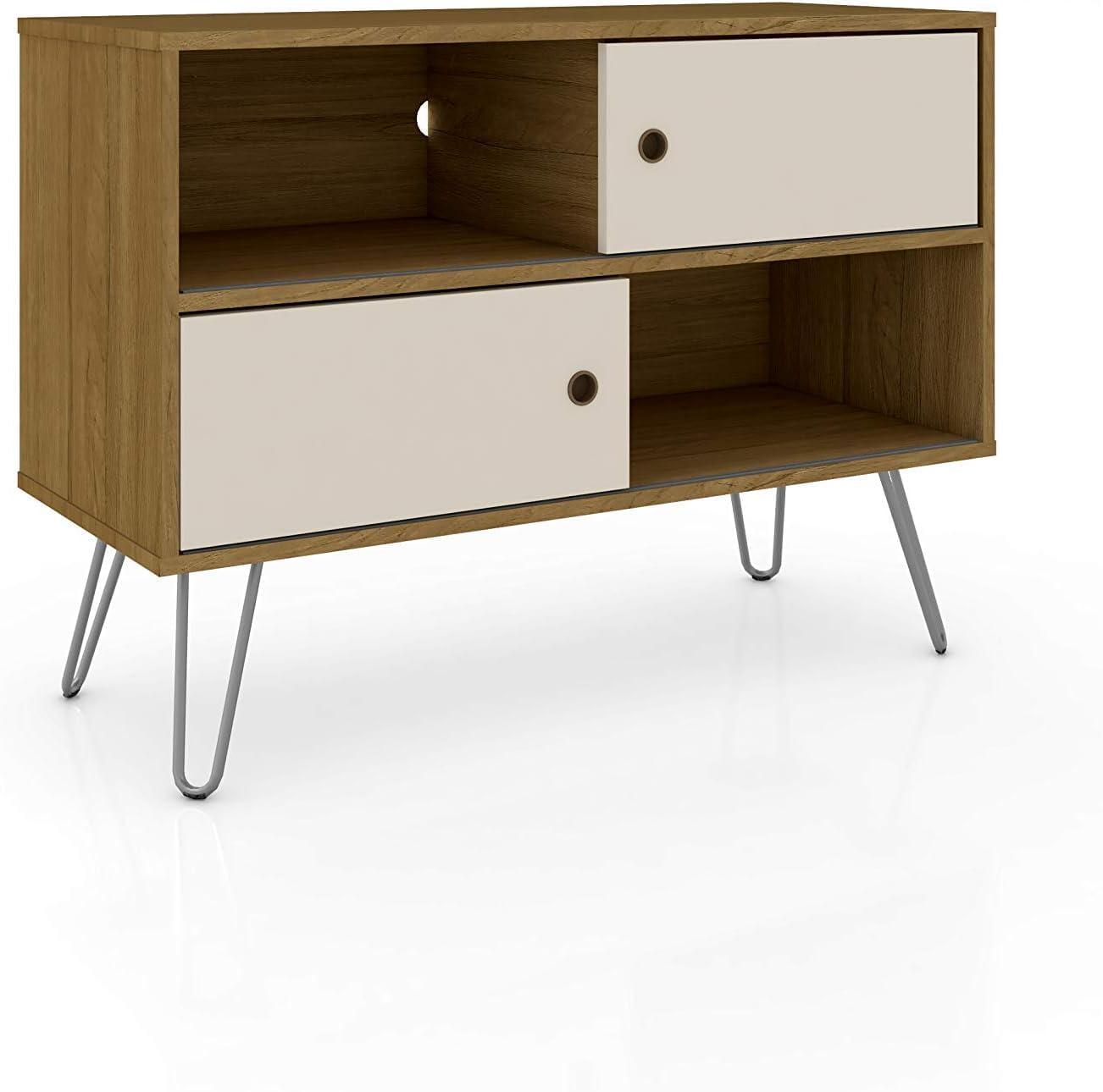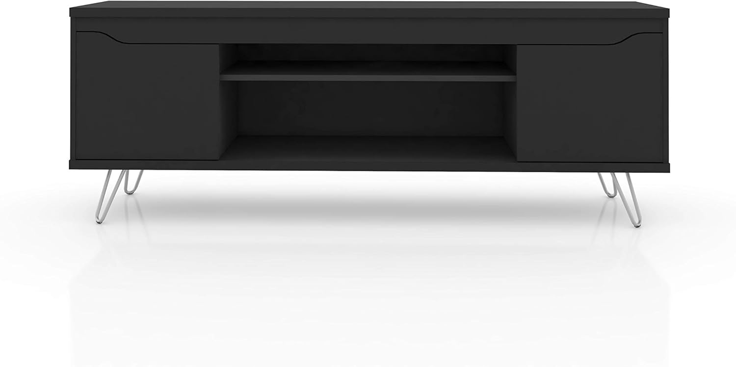 Upgrade your living space with the Manhattan Comfort Baxter Entertainment Center, a versatile addition to any modern home. This freestanding mid century modern TV console table, finished in stylish colors, effortlessly combines form and function. Ideal as a TV stand for the bedroom or living room, it supports televisions from 46" to 50" without the need for wall mounting. The Baxter Freestanding Entertainment Center is more than just a media center; it's a complete storage solution with multiple open shelves and compartments for all your media accessories, and a wine rack that can fit up to 20 bottles. The efficient cable management system keeps wires neatly concealed, enhancing the sleek look of your space. Whether you're looking for console tables for the living room or a sophisticated entertainment stand for your apartment, this modern entertainment center meets all your needs. Crafted with high-quality MDP/MDF materials and solid metal splayed legs, it promises durability and style. Perfect as a TV console with storage, this piece keeps your living area organized and clutter-free. Elevate your home décor with this multifunctional TV stand with storage, an essential piece of apartment furniture that brings both elegance and practicality to your living space.