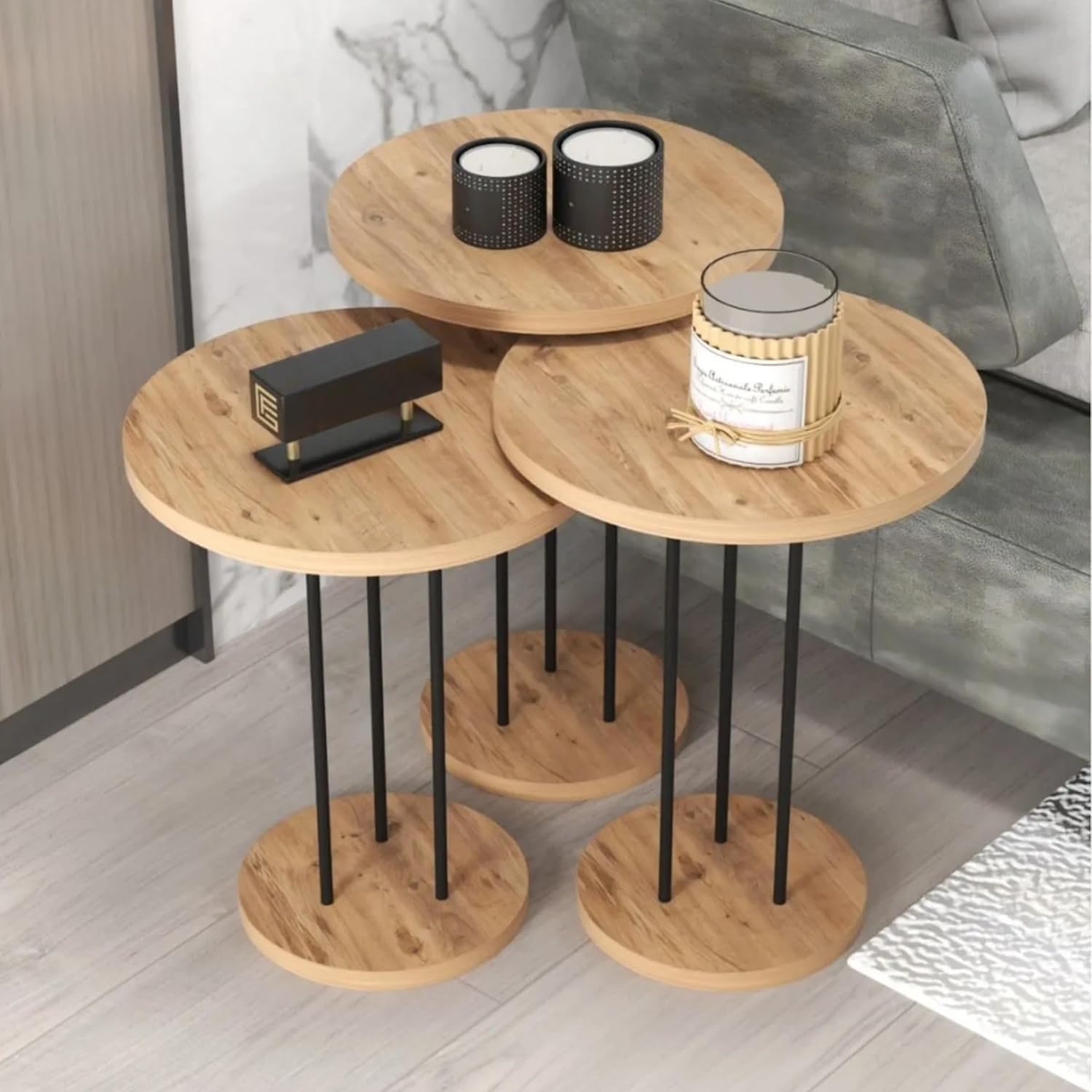 This set of three round nesting tables is designed to bring a modern touch to your living space. Crafted with high-quality particle board tops and metal legs, these tables are both stylish and durable. The tables come in varying heights to beautifully nest together or serve separately as needed. Perfect for complementing any room with their sleek, brown finish. Easy assembly with all hardware included.