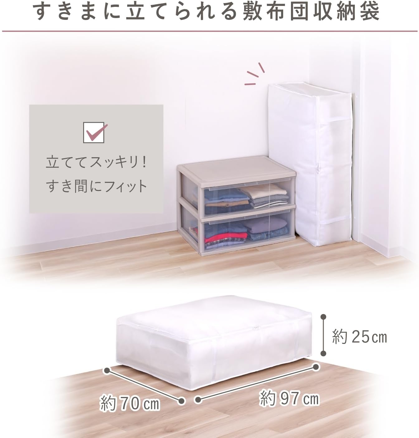 Product Name: Futon Storage Bag, White Color: White Size (W x D x H): Approx. 38.2 x 27.6 x 9.8 inches Material: Polypropylene Contents: 1 piece Country of Origin: China. Storage Guide: Single size futon Features: The breathable non-woven fabric keeps your guests and your spare futon protected from moisture and dust. The double slider opens wide to the shape of a C-shaped shape, so you can smoothly insert and remove your duvet. Simple and clean white color that matches both inside and closet. The front has 2 handles, so it is easy to remove the case after storage. [Note] Cannot be washed. What is non-woven fabric? Non-woven fabric (soft cloth) is a non-woven fabric that is made as a sheet without weaving or weaving fibers using threads. Breathable and dust resistant fabric is ideal for storing clothes and bedding In Astro we mainly use non-woven polypropylene fabric which is manufactured in the Spunbond method. ASTRO CO., LTD established in 1970