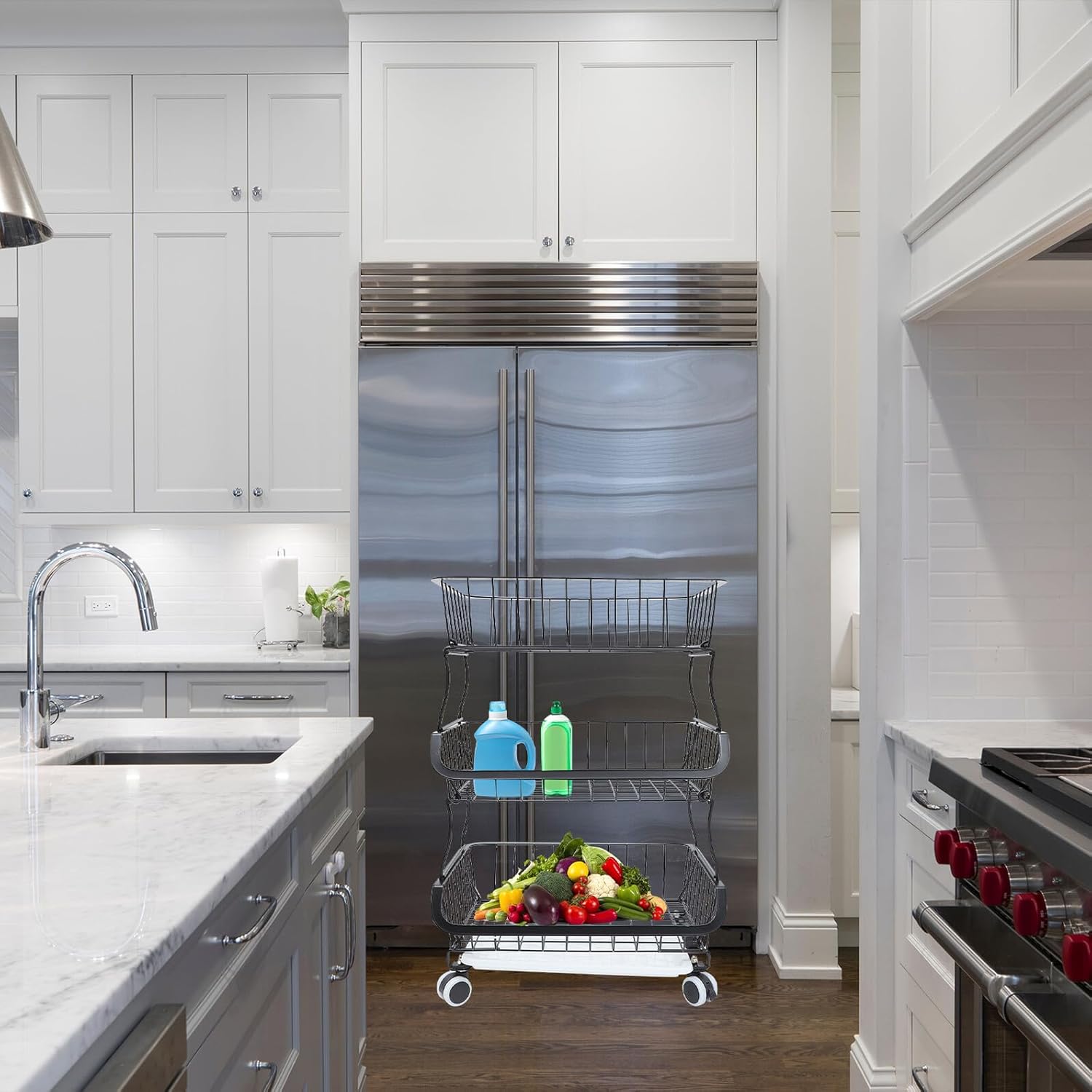 Package Include 1 x three-layer shelf 1 x drip tray 4 x universal pulleys 4 x fixed foot pads Characteristics -Product Info:Kitchen storage rack -Material: Iron. -Color: Black. -Size: About 80.00X41.00X29.00cm/31.44X16.11X11.40inch. -Provide more storage options for people who often cook, allowing them to enjoy in kitchen standing cart. -Fine workmanship, good texture, smooth hand feel, , safe to use vegetable shelf for kitchen -This is a very practical kitchen storage tool that will you a good experience kitchen three-layer storage rack. -It is safe and practical, smooth and bright, not easy to rust and fade, and has a shelves organizer. -The three-layer storage rack trolley saves space, is convenient for storage, and makes your kitchen more tidy trolley storage rack.Goods Descriptionmulti-function carts Made of craftsmanship and iron materials, it has excellent durability and practicality, easy to store, simple and efficient, can provide you with a convenient storage method, and you in .kitchen standing cart Are you looking for a professional, practical and kitchen storage rack cart? Our products will be your good choice