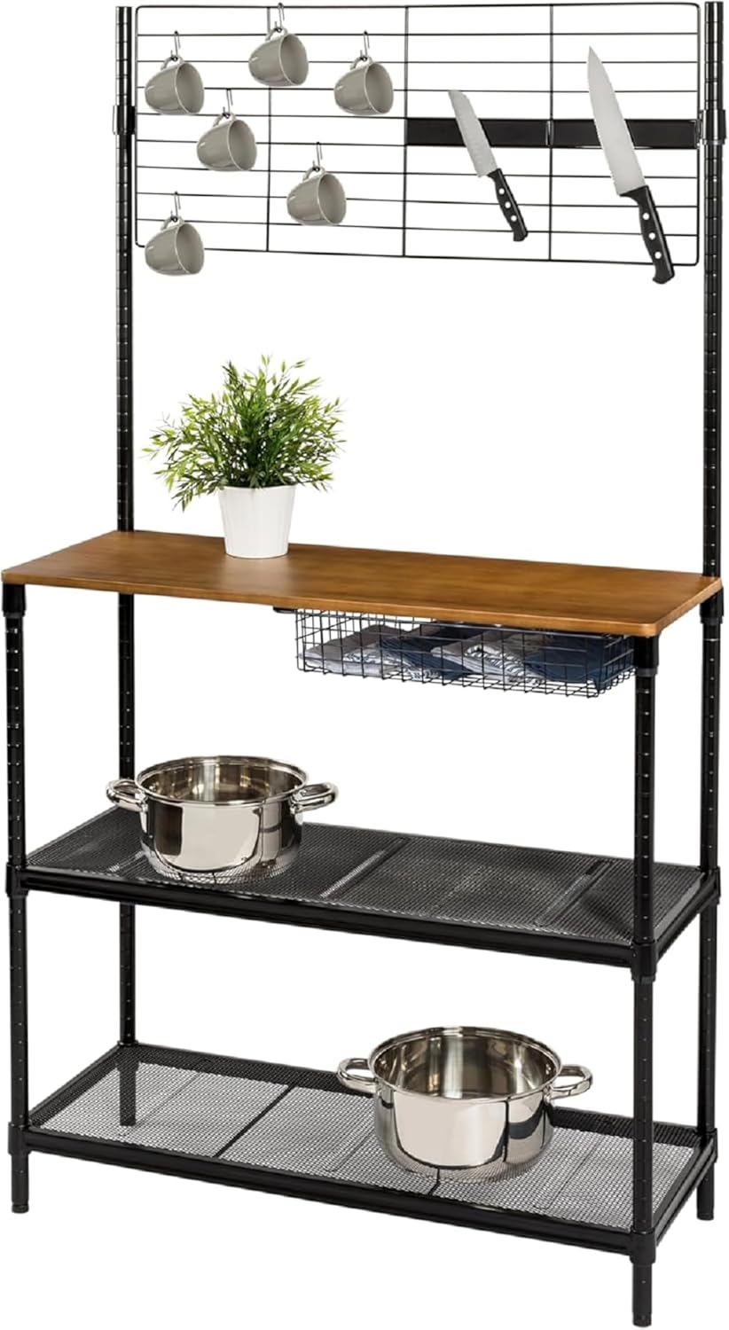 Surface is solid wood in updated finish and doubles as cutting board Wire grid for additional storage space - great to hang recipes or utensils Magnetic knife plate for safe storage Pull-out basket for easy-access items Features 2 adjustable mesh shelves for additional storage Made of sturdy matte black steel Dimensions: 35.5”W x 65”H x 14"D You have a limited number of kitchen cabinets and shelves, so this bakers rack comes in handy as a jack of all trades and its look adds to your kitchen design. Use the tabletop as a cutting board and hang everything from reminders to kitchen tools to keep them within reach. Its pull-out basket is perfect for kitchen tools and its durable steel frame will have this bakers rack keeping you company in your kitchen for years to come. Surface is solid wood in updated finish and doubles as cutting board Wire grid for additional storage space - great to hang recipes or utensils Magnetic knife plate for safe storage Pull-out basket for easy-access items Features 2 adjustable mesh shelves for additional storage Made of sturdy matte black steel Dimensions: 35.5”W x 65”H x 14"D You have a limited number of kitchen cabinets and shelves, so this bakers rack comes in handy as a jack of all trades and its look adds to your kitchen design. Use the tabletop as a cutting board and hang everything from reminders to kitchen tools to keep them within reach. Its pull-out basket is perfect for kitchen tools and its durable steel frame will have this bakers rack keeping you company in your kitchen for years to come.