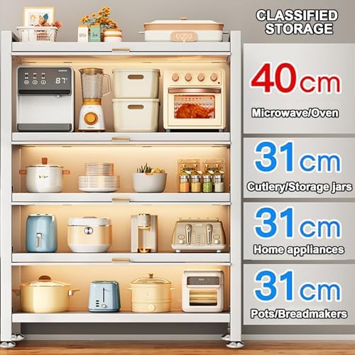 Are you tired of the clutter in your kitchen? Transform your cooking space with our versatile kitchen storage rack, designed to enhance organization and efficiency. This 4/5-tier microwave stand features 3/4 high transparent flip doors, allowing you to effortlessly store and access your kitchen utensils and appliances. Constructed with a robust metal frame, this kitchen storage cabinet provides exceptional durability and can support a total weight capacity of up to 200kg (440lb). Its thoughtful design maximizes storage space, making it ideal for various uses. Whether you need a reliable kitchen baker's rack, a microwave oven stand, or a spice rack organizer, this multifunctional shelf adapts to meet your needs. Imagine hosting friends and family in a tidy kitchen where everything is in its place. The kitchen workstation shelf not only elevates your cooking experience but also complements any kitchen décor with its sleek white finish. Product Details: - Color: White - Material: Metal & Plastics - Number of Shelves: 4/5 - Max Load Capacity: 200kg (440lb) - Assembly Required: Yes - Dimensions: - 4 layers: 57x42x119cm (23.6x16.5x46.8in), 80x42x119cm (31.5x16.5x46.8in), 100x42x119cm (39.4x16.5x46.8in) - 5 layers: 57x42x151cm (23.6x16.5x59.4in), 80x42x151cm (31.5x16.5x59.4in), 100x42x151cm (39.4x16.5x59.4in) Elevate your kitchen storage solutions today with our kitchen shelf and create a neat, functional space that inspires culinary creativity!