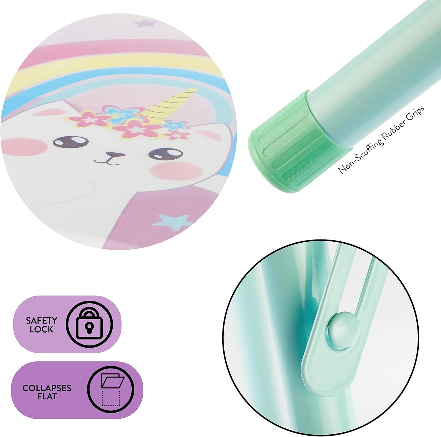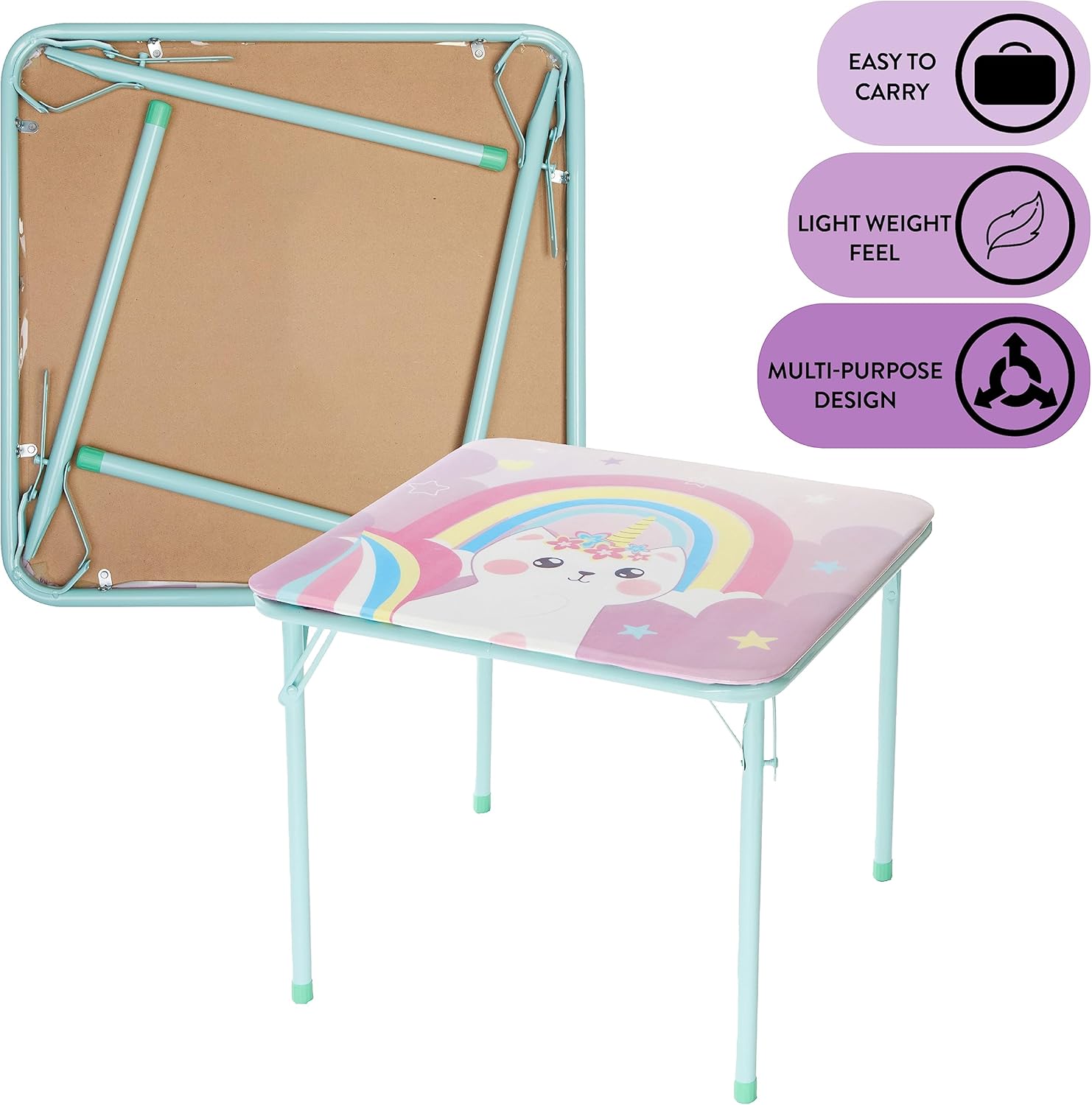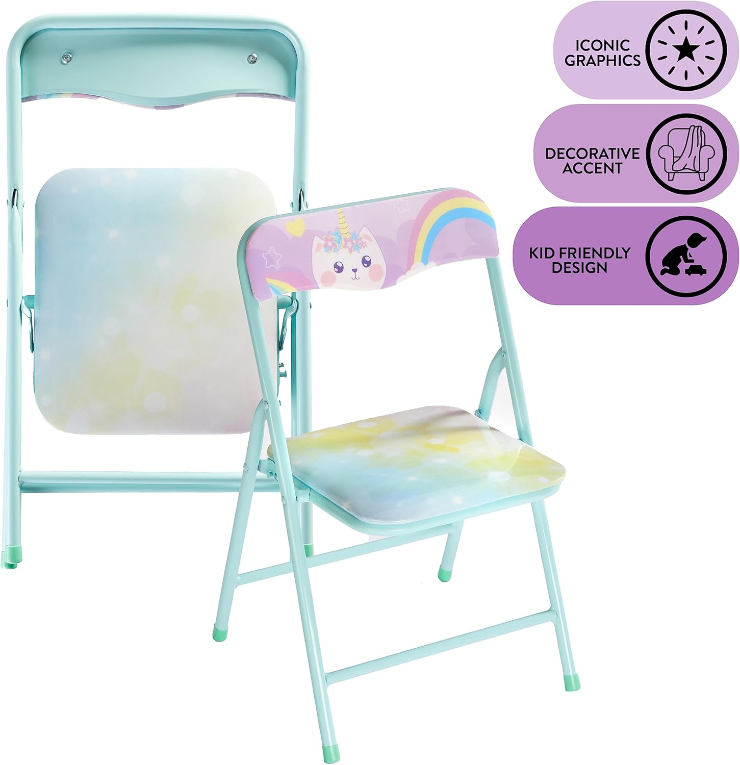Give your little ones their own place to spend time with this Heritage Kids Caticorn 3 Piece Square Metal Table And Chair Set. With bright colors and a stable build, it is a constructive way to keep your children occupied and entertained during study time, meal time or play time. It is also collapsible so that you can store or transport it with ease. The Caticorn 3 Piece Square Table And Chair Set also provides some extra seating space for when your kid's friends visit or when you have dinner guests with young children. Little ones will be thrilled with the dazzling and vibrant graphics. This versatile table is also a great choice for classrooms, day cares or anywhere else that learning takes place. The Caticorn 3 Piece Square Table And Chair Set includes two folding chairs and table that meaures 24" x 24" x 20". Designed with a washable surface, it is super easy to clean and maintain, so you can be sure that it will stand the test of time.