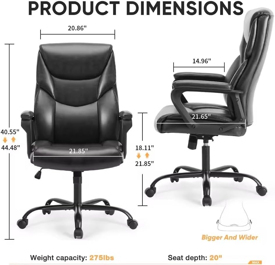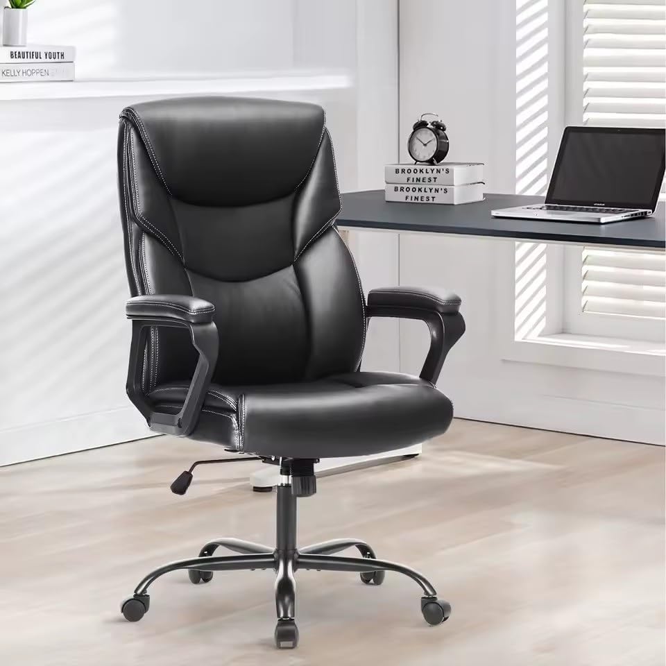Upgrade Your Workspace Boasts a soft Leather Soft back and seat paired with a sleek metal base and armrests all highlighted by an attractive horizontal line stitching to boost your desk or work areaSpecification:Name: Office ChairsMateria: PU leatherInternal filling material: Spongecolor:BlackOffice Chair Dimensions: (As shown)Rotation: YesWheels: YesCan be raised or lowered: YesThis package includes:1 office chair (excluding other exhibits)Notes:Due to manual measurement, please allow for a difference of 1-3 millimeters. Thank you for your understanding!Due to differences between different monitors, images may not reflect the actual color of the product.