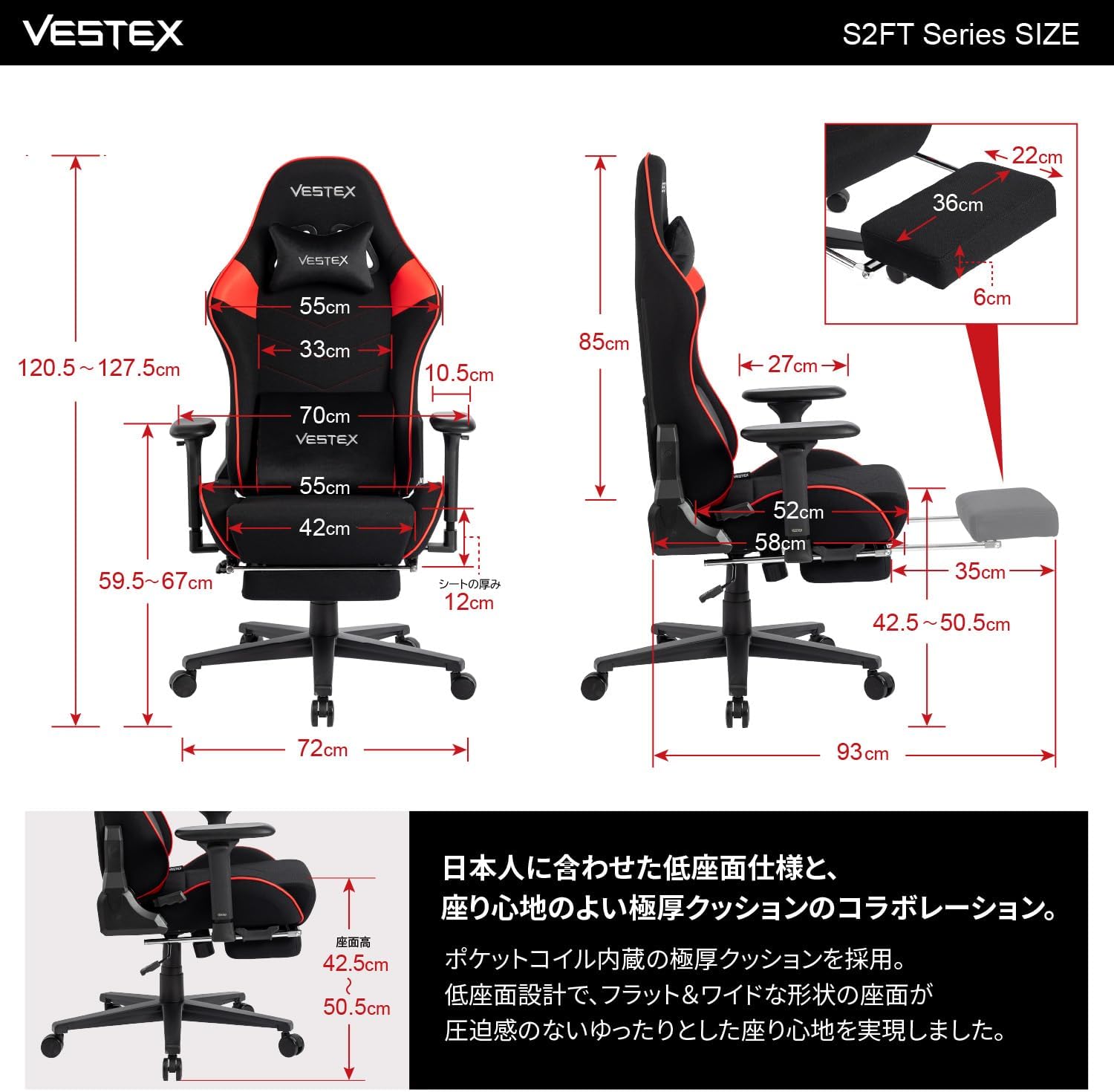 VESTEX S2 Series (Model with Footrest) Low seat design for Japanese people. Made with high water repellent high-grade fabric that is resistant to moisture and dirt. The seat is made of 5 layers of molded urethane with a pocket coil and the spacious seat size creates a comfortable sitting experience. This model combines a variety of functions, such as a reclining function of up to 150° including a locking function from 80° forward tilt, lumbar support with vibration function, 3D armrests, and back pockets. Reliable domestic support. Comes with a 2 year warranty. Product Details: Size: Width 28.3 inches (72 cm), Depth 28.3 inches (72 cm), Height 47.2 - 50.5 inches (120.5 - 127.5 cm), Seat Height 16.7 - 19.9 inches (42.5 - Upholstery: Polyester, PU leather. Recliner: Up to 150° (backrest reclining 135° + seat rocking 15°). Lift Function: Gas pressure cylinder (CLASS4). Armrest: 3D wide armrest (raises up and down, front and back slides, left and right oscillation) Foot Base: Steel Casters: 2.4 inches (60 mm) PU casters. Load Capacity: 264.6 lbs (120 kg). Recommended Height: 61.0 - 70.9 inches (155 - 180 cm).