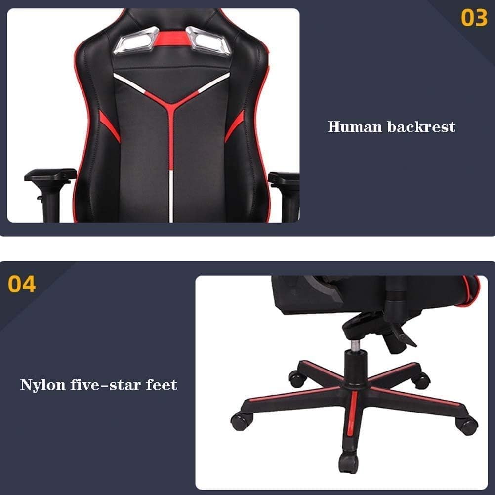 PC Gaming Chair: Gaming & Working & Relaxing & Sleeping High density new sponge, full modeling, good elasticity and long time without variant. Office chair for lifting the seat, pull up the pneumatic control handle. To lower the seat, pull the handle up until you reach the desired height. To tilt the lock, backwards until you need it. Function: gaming office chair has beautiful generous and strong practicality. This office chair has large cushions with headrest. Size and look make the office chair ideal for any conference room or office seat, the back executive chair styling to make you feel relaxed. The computer desk chair with sturdy metal base is an attractive contrast to the black finish, with height adjustment. 360 degree rotating wheel and chair can be more flexible in the workstation. Specification: Material: PU leather Style: simple frame: metal frame Inner filling: high elastic foam sponge With or without armrests: Can be rotated: Yes Load capacity: 300 lbs Package includes: 1 x Racing style chair. Comfortable support and swing high backrest. Additional padded backrest provides optimal lumbar support. Equipped with firmly padded armrests, the rocking function can be adjusted from 90 to 110 degrees. FLEXIBLE & PRACTICAL This office chair can be rotated 360 degrees and has a wide range of movements. 5 smooth rolling wheels make it easy for you to roll around the room as needed, realizing the convenience of multitasking. Ergonomic office chair, executive chair, comfortable all day, no back pain, suitable for games/work.