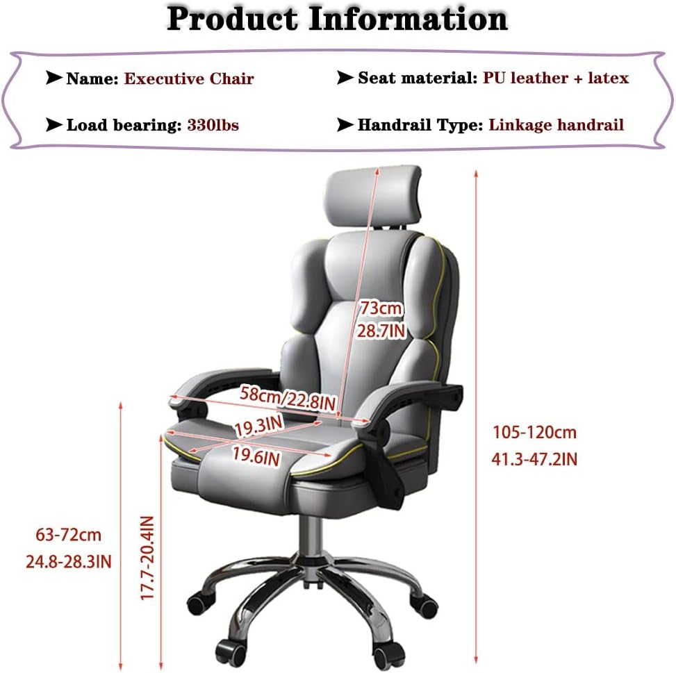 ----Executive chair with adjustable headrest▸The multi-dimensional free-rotating headrest can share the pressure on the cervical spine and help support the weight of the head, making work easier!📚【Product Specifications】:▸Name: Executive Chair / Managerial Chair / Executive office chair / Computer Desk Chair / Ergonomic Desk Chair / Work chair / Gaming Chair▸Color: Gray chair , Black chair , Pink chair , Yellow chair , White chair▸Material: Seat: PU leather + latexChassis: Aluminum alloyWheels: PU▸Size: 58*105-120cm/22.8*41.3-47.2inches▸Backrest adjustable angle: 90°-135°▸Chair rotation angle: 360°▸Headrest adjustment angle: 160°▸Headrest lift height: 10cm▸Load bearing: 150kg/330lbs▸Handrail Type: Linkage handrail▸Whether to assemble: yes▸Pneumatic rod: SGS certification▸Packing list: Managerial Chair * 1▸Applicable scene: home, office, conference room, study, bedroom⚠️【Note】1. We only sell executive Chair, the others are props2. Due to manual measurement, please allow a difference of 1-3cm3. Due to the different shooting tools used, slight chromatic aberration may appear
