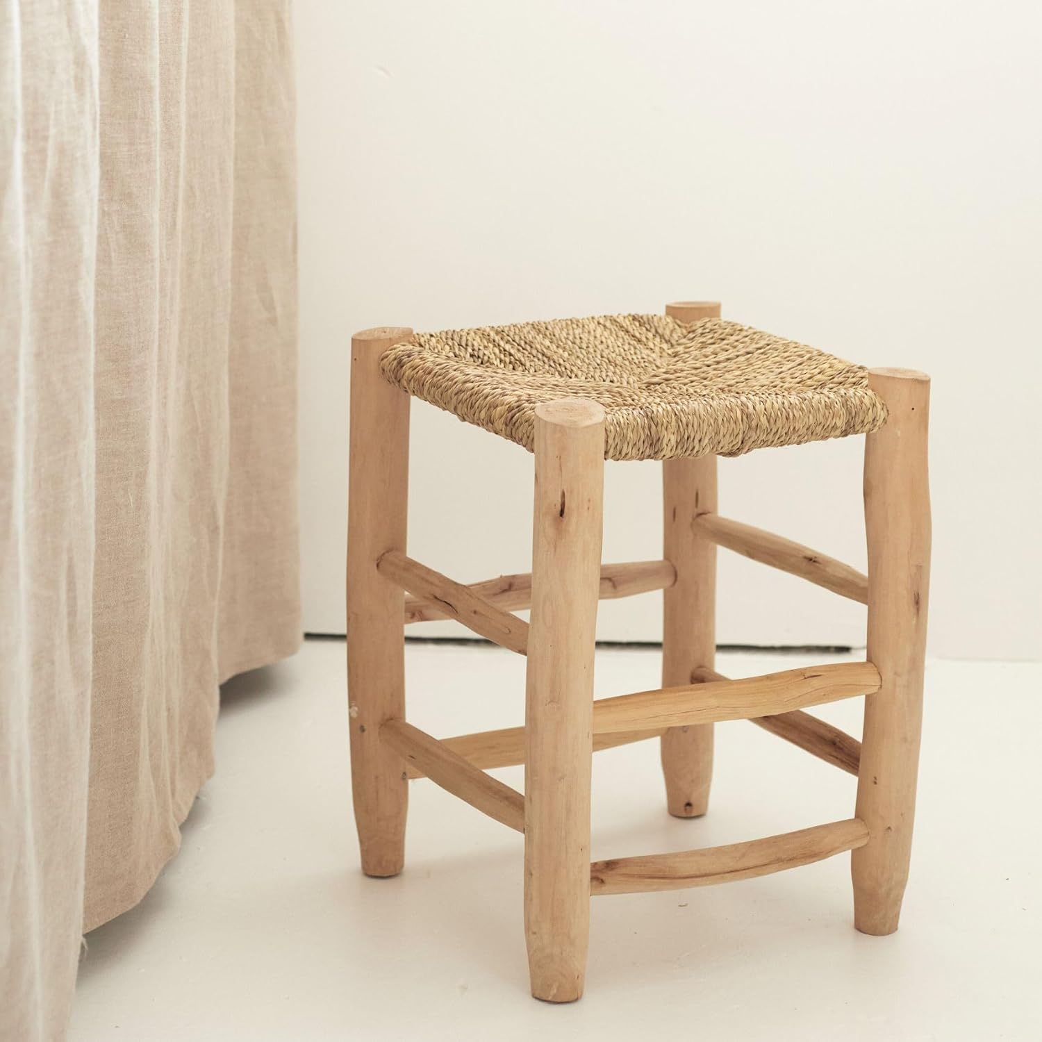Stool made of laurel wood and palm fibres. The traditional Moroccan stool made of laurel wood and its seat made of rolled and then braided palm fibres is now a staple for interior design. This stool is not only timeless, but also practical for the classic seat at the table, in the entrance area or in the bathroom, but also at the end of a sofa or bedside table for a natural atmosphere. The artisanal production makes your stool unique. Dimensions and colours may vary slightly from room to room. This low wooden stool comes in different sizes: S: height 20 x 20 x 20 cm, M: height 30 x 30 x 30 cm, L: height 40 x 30 x 30 cm, material: solid laurel wood, palm fibres. Colour: natural
