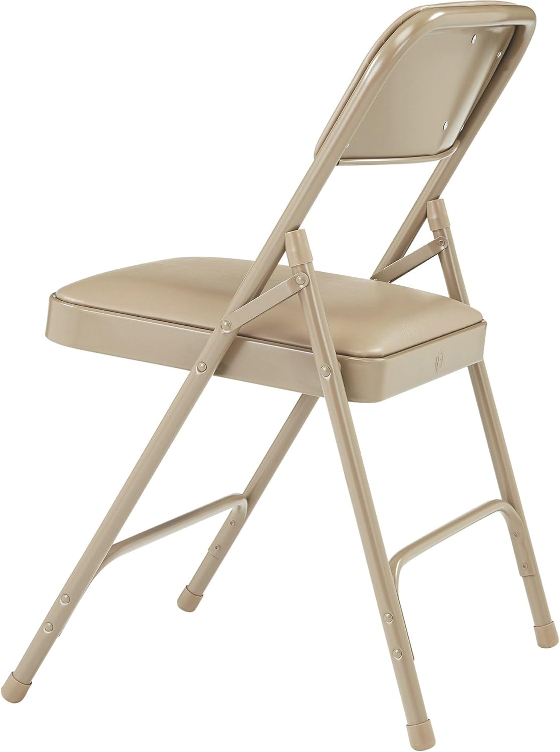 The National Public Seating Folding Chair features an electromagnetically welded steel back and steel seat. Its 18-gauge 7/8in. round tubular frame features double hinges for added stability and durability, two U-shaped double riveted cross braces and a powder-coated finish. Chair also features color coordinated polypropylene glides and V-tip plugs for added stability. Sold in a pack of 52 chairs.