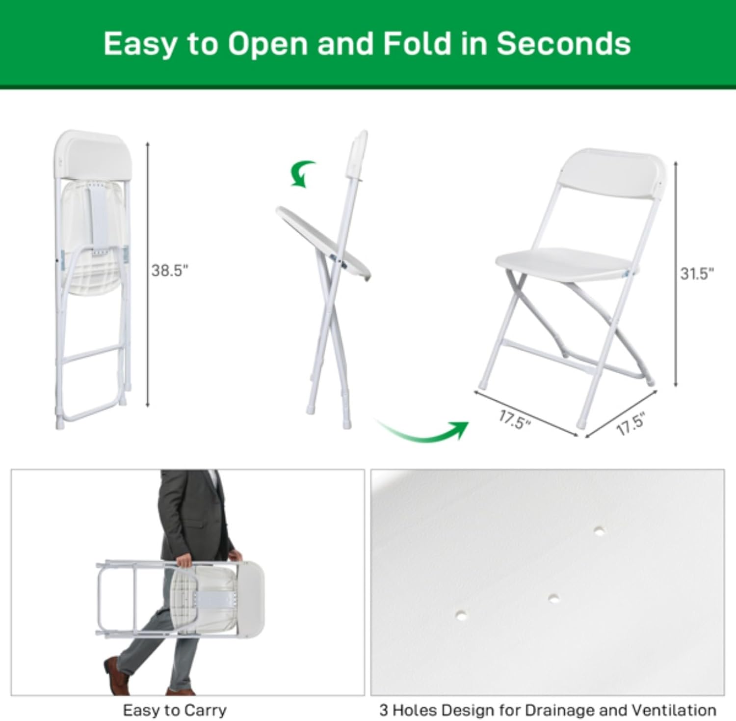 Introduction: Plastic folding chairs are ideal for gatherings, parties, homes, offices, churches, schools, picnics. They won't break due to heavy plastic material and powder-coated metal material. The chairs can bear up to 350 pounds with upgraded tube and metal thickness. The plastic chairs are lightweight, so we can move them effortlessly. Specifications: 1. Material: PP Iron 2. Color: White 3. Weight: 42.99 lbs/19.5 kg 4. Size: (17.72 x 18.9 x 31.5) inches/(45 X 48 X 80) cm (L x W x H) 5. Weight capacity: 350 lbs Package includes: 6 x Plastic folding chairs