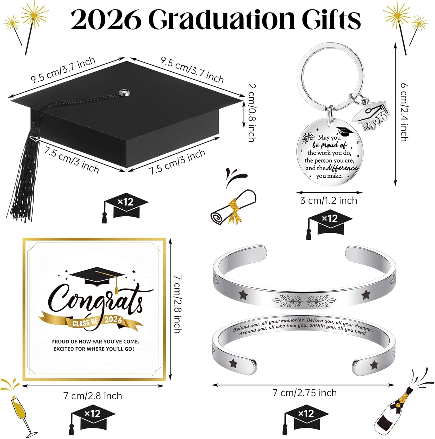 Product Parameter: Size: As shown Color: As shown Package Includes: 1 x stainless steel bracelet 1 x stainless steel keychain 1 x grad cap gift box 1 x nonwoven gift bag 1 x graduation card