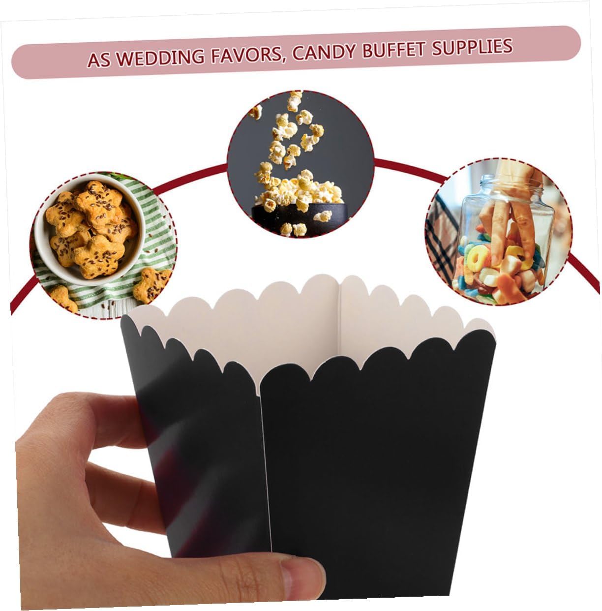 Package List Popcorn Boxes Characteristics -Material:white cardboard -Size:10.70X7.50X5.50cm/4.21X2.95X2.16in -Product Info:Popcorn box -Color:Black - Fill popcorn box with fried food, popcorn or any special goodies you would like to present to the guests popcorn treat boxes. - Made with safe white cardboard, will and reliable, great for all your special occasions and events popcorn carton. - Especially suitable for movie theater, birthdays, parties, performance decorations, provide huge storage convenience party snack container. - Lightweight, these paper Popcorn Boxes are portable to hold and carry, not waste too much effort, not easy to tear small popcorn bowls. - Impress your guests with these popcorn boxes, perfect for storing popcorn, and you will love these boxes when seeing film snack containers.Goods Descriptionsmall paper popcorn containers The paper Food Box also can be regarded as candy box, treat box or party favor box.popcorn buckets The popcorn box can hold many snacks time, suitable for holding popcorn, candy and other food or snacks for celebrations and parties