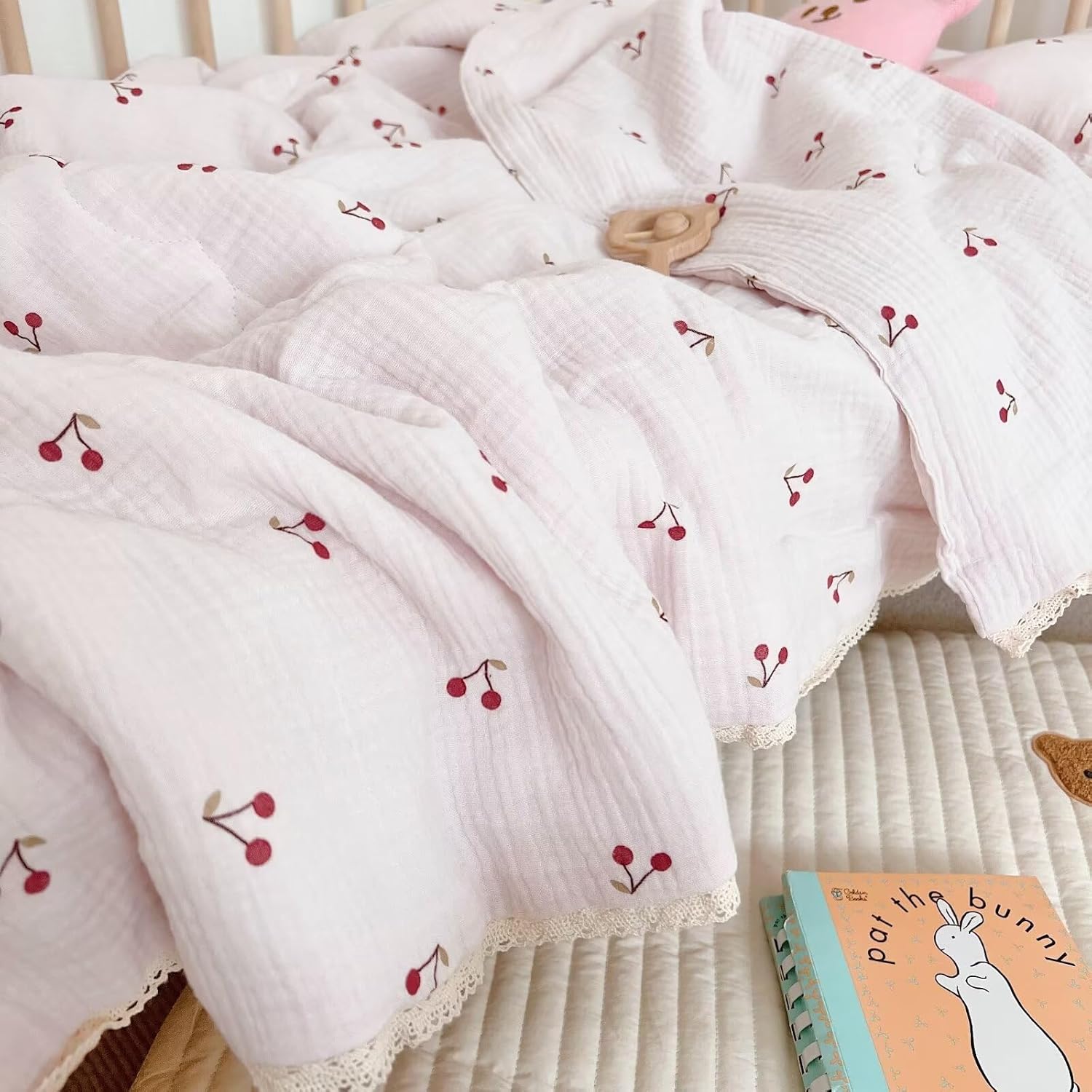 Muslin kids bedding set includes 1 cherry print quilted blanket (60"x 78") and 1 cherry print pillow case (20"x 26"). Suit for children's twin size bed.