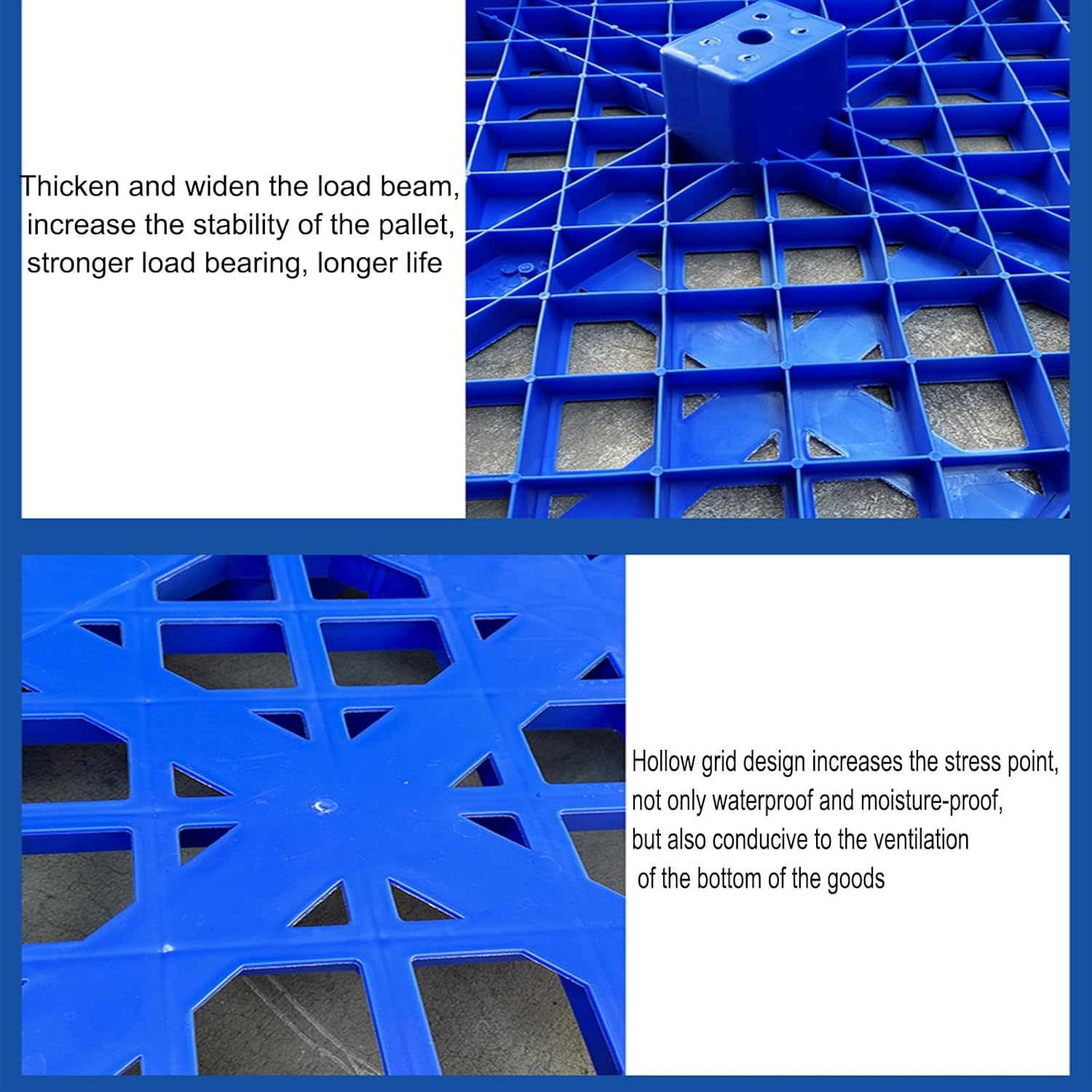 Made of polyethylene, lasts longer than most pallets, helps pallets from slipping off forks during transport, and can be stacked for efficient storageName: plastic palletMaterial: high-density polyethyleneSize: 80x100cm , 100x100cm , 80x110cm , 90x110cm , 110x110cm , 80x120cm , 110x120cm , 120x120cm , 110x130cm , 120x130cmColor: BluePacking list:Plastic tray x 1Company ProfileXBAOMING was established in 2013. Our company mainly consists of plastic pallets, transportation grid mats, plastic logistics pallets, storage pallets and so on. We are committed to providing you with high quality products and impeccable customer service