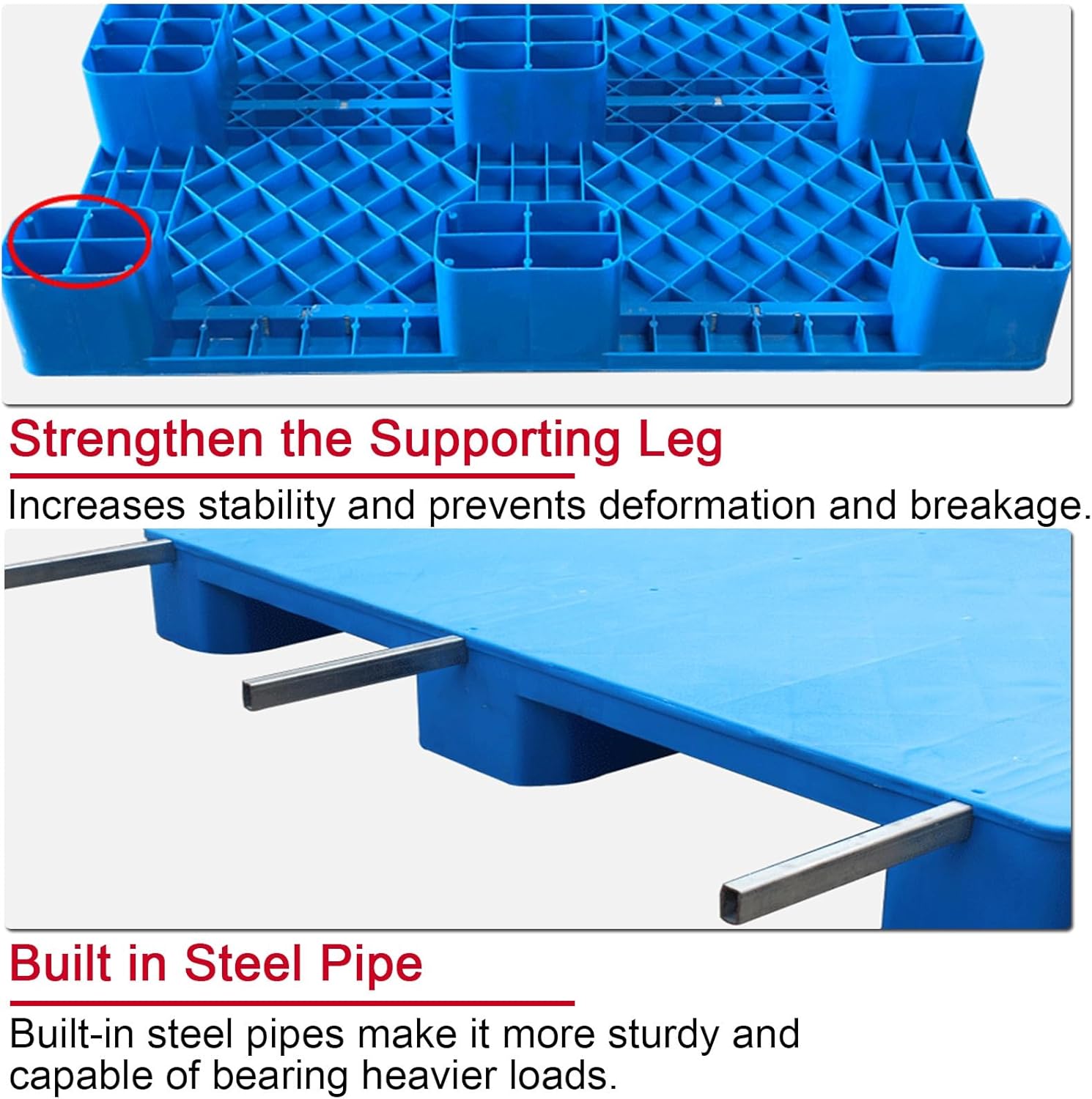 Product Description:Our heavy-duty nine-legged plastic pallet is designed for strength, safety, and adaptability, aiming to meet the demanding requirements of modern warehousing, factory operations, supermarket storage, and logistics handling.Features:Thickened MaterialMade from high-density HDPE material, it offers excellent impact resistance and weather resistance. Its robust structure ensures long-term reliability.Rounded Corner Anti-Collision DesignThe curved corners increase the contact area and disperse impact force, reducing the risk of damage during forklift handling and collisions.Reinforced Bottom and Leg StructureThe pallet bottom features cross-shaped reinforcing ribs, and the leg supports are strengthened to maintain structural integrity under heavy loads.Built-in Steel PipesFor even greater strength, this pallet is equipped with internal steel pipes, significantly increasing its load-bearing capacity.Stackable and Space-SavingThe uniform design of the pallets allows them to be safely stacked when not in use, optimizing storage space in your facility.Product Specifications:Name: Plastic PalletMaterial: HDPE materialColor: BlueDesign: Reinforced back, built-in steel pipe reinforcement, stackable storage.Features: Moisture-proof, frost-proof, easy to clean, reusable.Static Load Capacity: 4000kg/8800lbDynamic Load Capacity: 1000kg/2200lbDimensions: 80x60x14cm/31x24x5.5in, 100x60x14cm/39x24x5.5in, 100x70x14cm/39x28x5.5in, 100x80x14cm/39x31x5.5inPackage Includes:1 x Heavy-duty nine-legged plastic pallet + 3 steel pipes