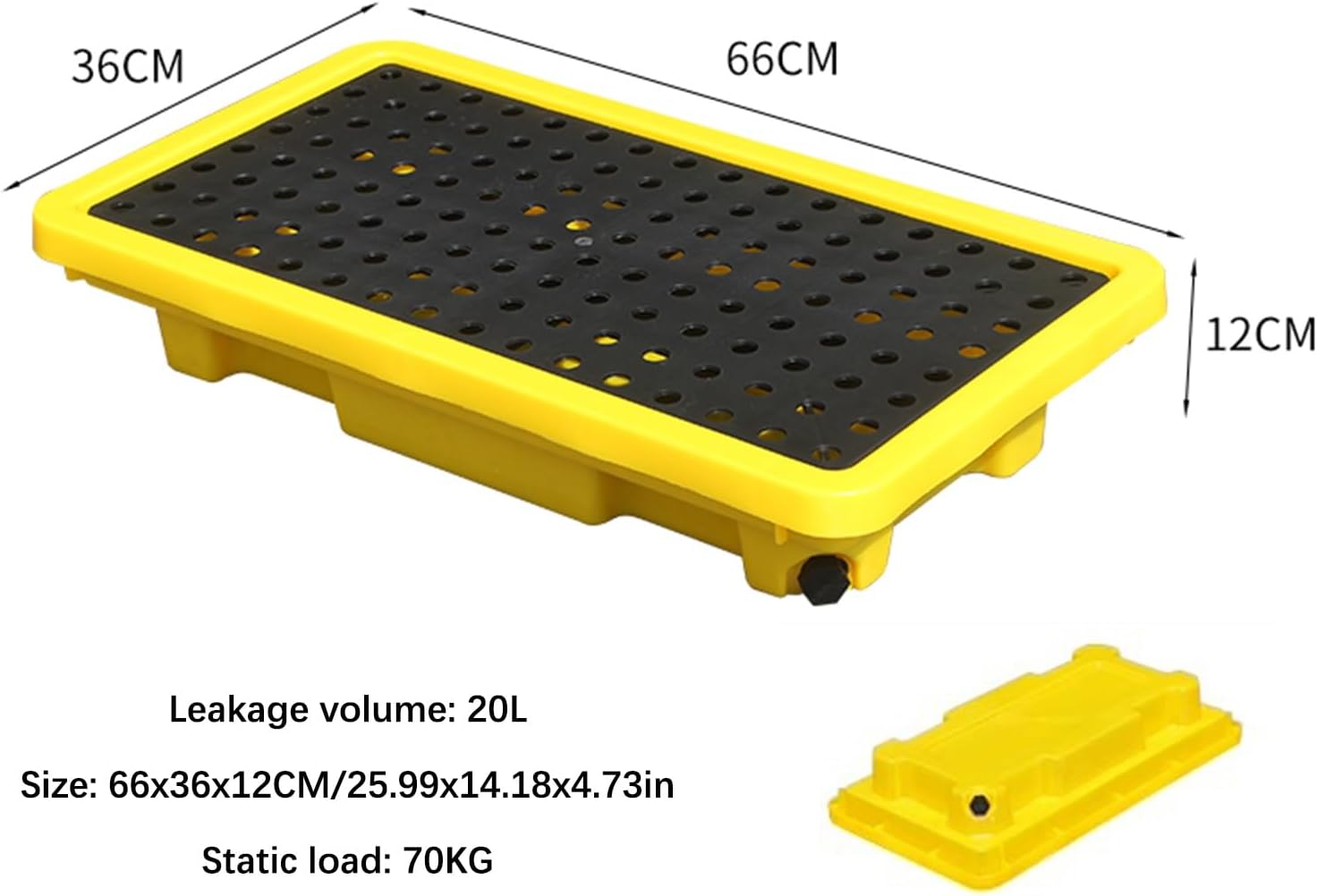 Oil Drum Stackable Capacity Grating Pallet: Features The nut-type sewage outlet design ensures liquid sealing and no leakage, making sewage treatment more convenient Spill platform can be combined freely, You can splice multiple platform together according to your own needs, convenient to use Specification Name: Spill Platform/Spill Containment Tray/Polyethylene Pallet/Grid Pads/Plastic Pallets Material: Polyethylene Color: Yellow + Black Size: 33x33x5.8CM/13x13x2.29in , 49x33x9.5CM/19.3x13x3.75in , 49x36x10CM/19.3x14.18x3.94in , 66x36x12CM/25.99x14.18x4.73in , 66x66x15CM/25.99x25.99x5.91in , 72x72x16CM/28.35x28.35x6.3in , 120x60x17CM/47.25x23.63x6.7in , 130x68x15CM/51.18x26.78x5.91in , 130x68x17.5CM/51.18x26.78x6.89in Function: Leakproof/Anti-slip/Ventilation Applicable scene: Home/Warehouse/Factory/Workshop/Kitchen/Outdoor/Industrial Parks Packing list 1 x Spill Containment Pallet Tips We sell pallet, the others are exhibits