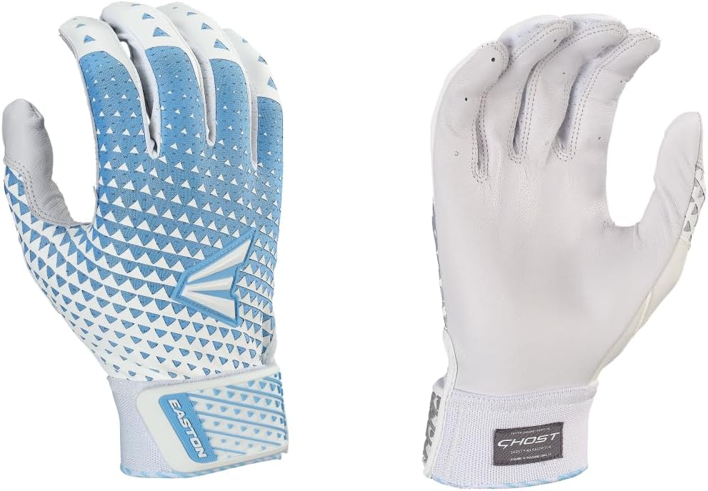 These Easton Ghost NX Fastpitch Batting Gloves give softball hitters superior comfort, grip, and style when they step into the box. The upgraded one-piece goatskin leather palm is ultra durable, so these gloves hold up through long sessions in the cage. Also, the back-of-hand material is made of Lycra infused with Structured-Flex Silicone for an ideal fit that's firm, but not too tight. The Bio-Dri wrist liner wicks away sweat and moisture, keeping your hands dry and comfortable. And as for style, with a special new design and nine different colorways, you're sure to find something that matches your team and your personal flair.