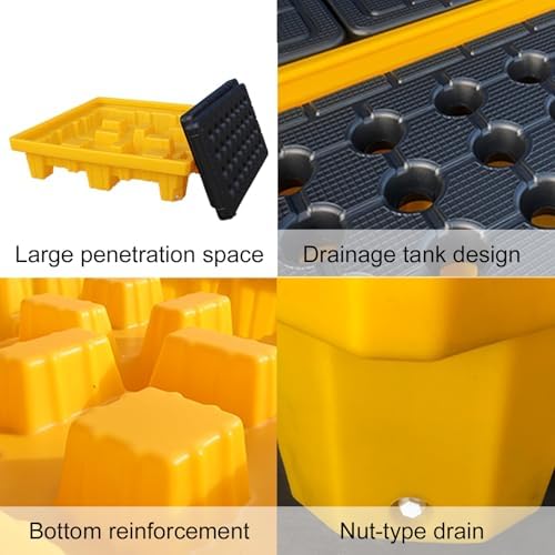 The leak-proof pallet, also known as a modular spill platform, is designed to provide a secure and clean solution for handling oil drum items and other liquids in various settings. Its leak-proof platform offers ample space and overflow capacity, significantly reducing the risk of spills and keeping the floor clean. The top grille is easily removable, facilitating effortless cleaning and maintenance. This product is ideal for use in warehouses, workshops, maintenance areas, supermarkets, and both industrial and commercial environments. Made from durable polyethylene material, it comes in a vibrant yellow color. Available in multiple sizes to suit different needs: 85x85x15.5cm, 125x85x15.5cm, and 130x68x15cm. The product is sold individually or in sets of 2, 3, 4, or 5 pieces, ensuring you can choose the quantity that best fits your requirements. Please note, this listing is for the leak-proof pallet only and does not include any additional items.