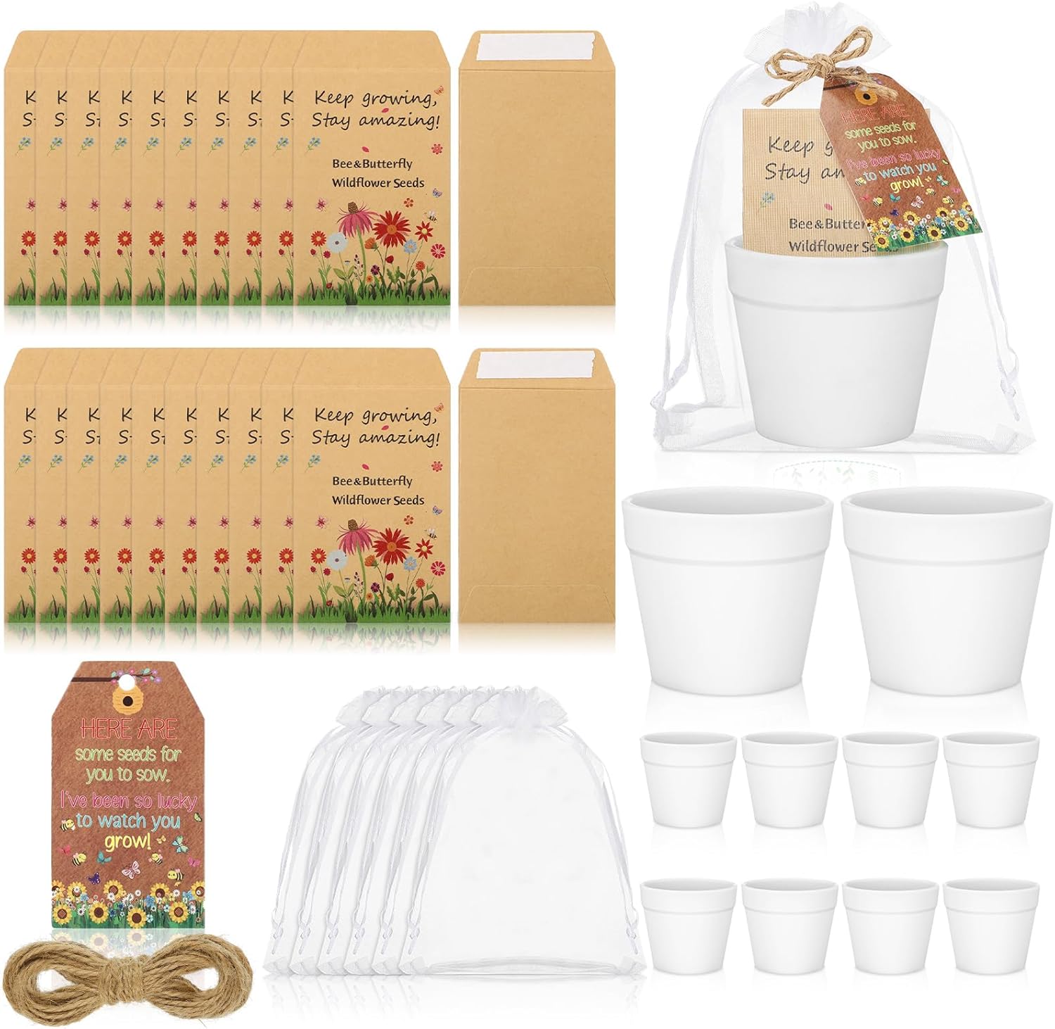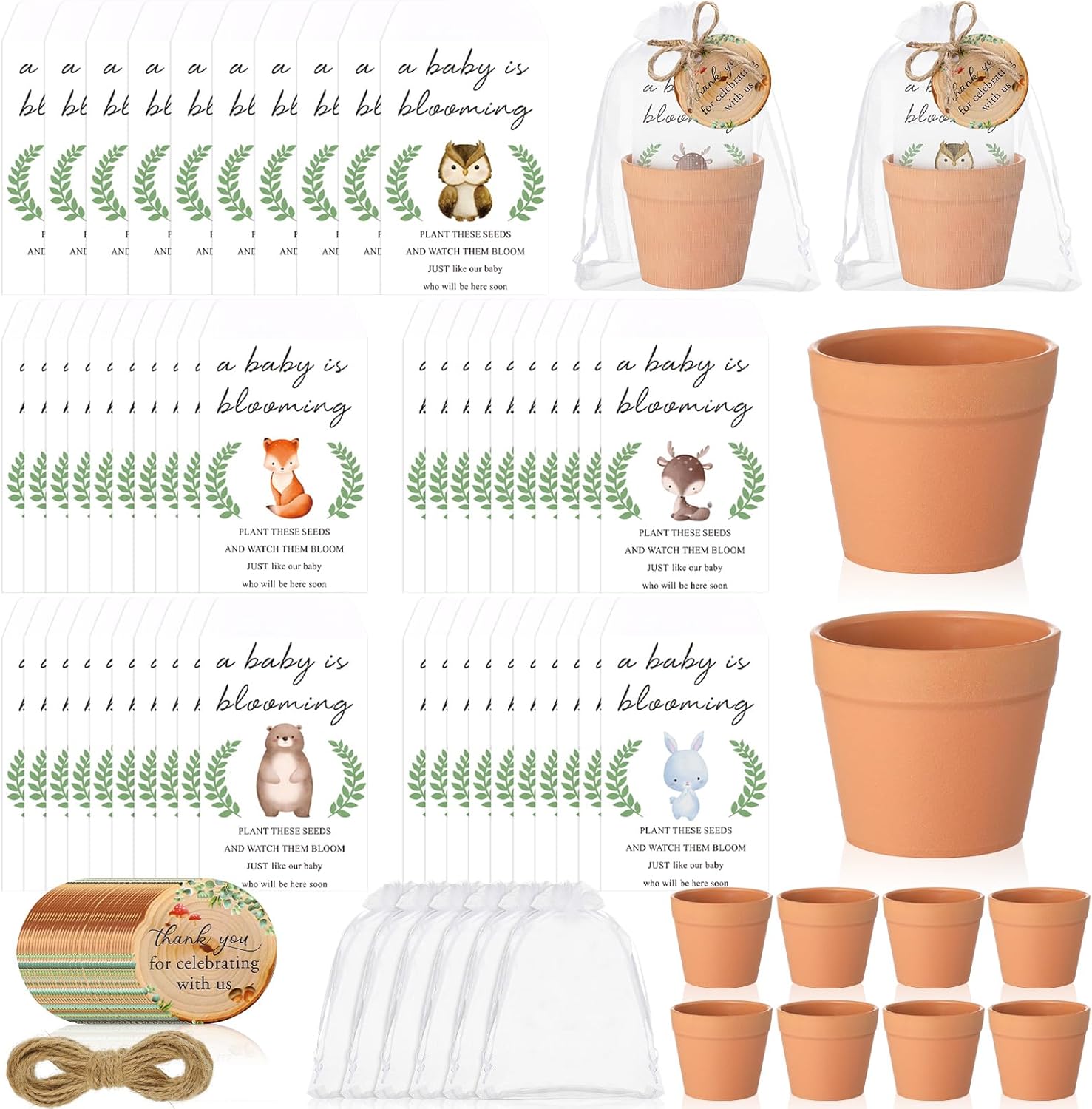 Features: Versatile Usage: These baby shower guest gifts are ideal for baby showers and other celebrations. Providing a visual treat, these gifts symbolize new life, growth, and blessings. Convenient Usability: This guest gift set is designed for easy use. The back of the seed bags is sticky and easy to seal, making these baby shower gifts quick to prepare and distribute. Please note, however, that seeds are not included in the package. Specifications: Material: Seed bag: double offset paper Potted plant: plastic Card: paper Organza bag: organza Main color: white Size: Seed bag: 2.36 x 3.54 inches/ 6 x 9 cm Potted plant: 2.36 x 2.76 inches/ 6 x 7 cm Card: 1.97 x 1.57 inches/ 5 x 4 cm Organza bag: 5.12 x 7.09 inches/ 13 x 18 cm Package includes: 50 x Seed bag 50 x Potted plant 50 x Card 50 x Organza bag 1 Roll of 20 M hemp rope Notes: Manual measurement, please allow slight errors on size. The color may exist a slight difference due to different screen displays