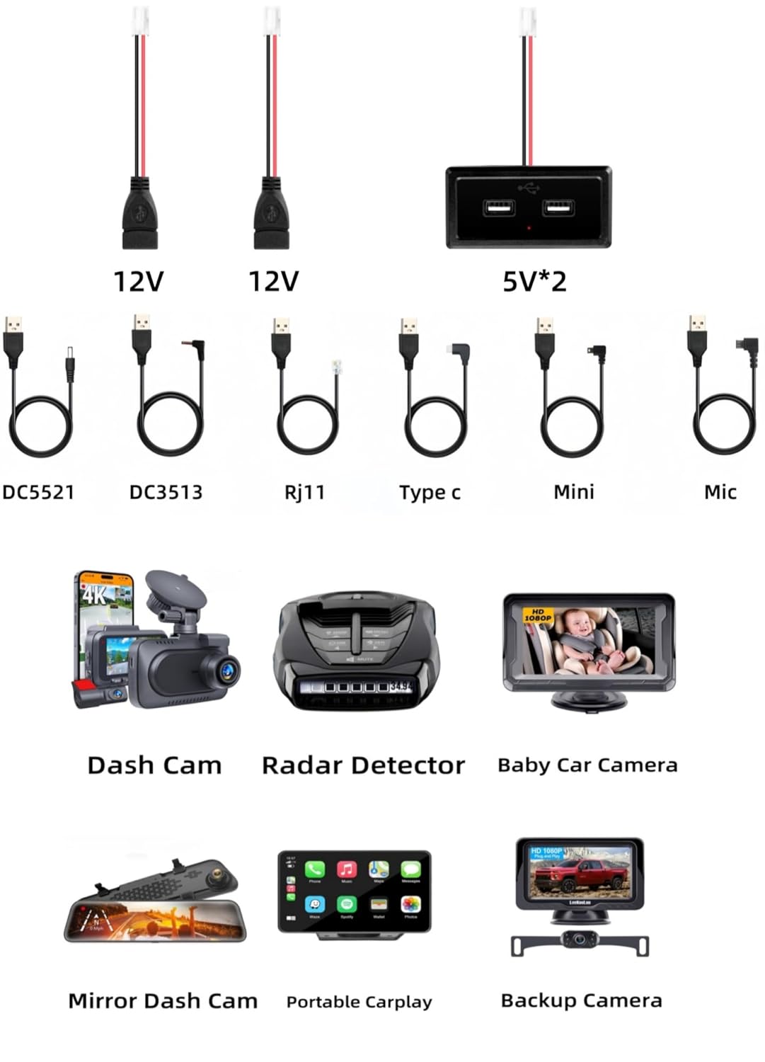 Dash Cam Multi-Interface Hardwire Kit,Baby Car Camera power cord adapter suitable for 5V and 12V multiple devices,such as Baby Car Camera/Radar Detector/Portable Carplay Screen for Car/Backup Camera/Rear View Mirror Camera/Navigation (13ft)