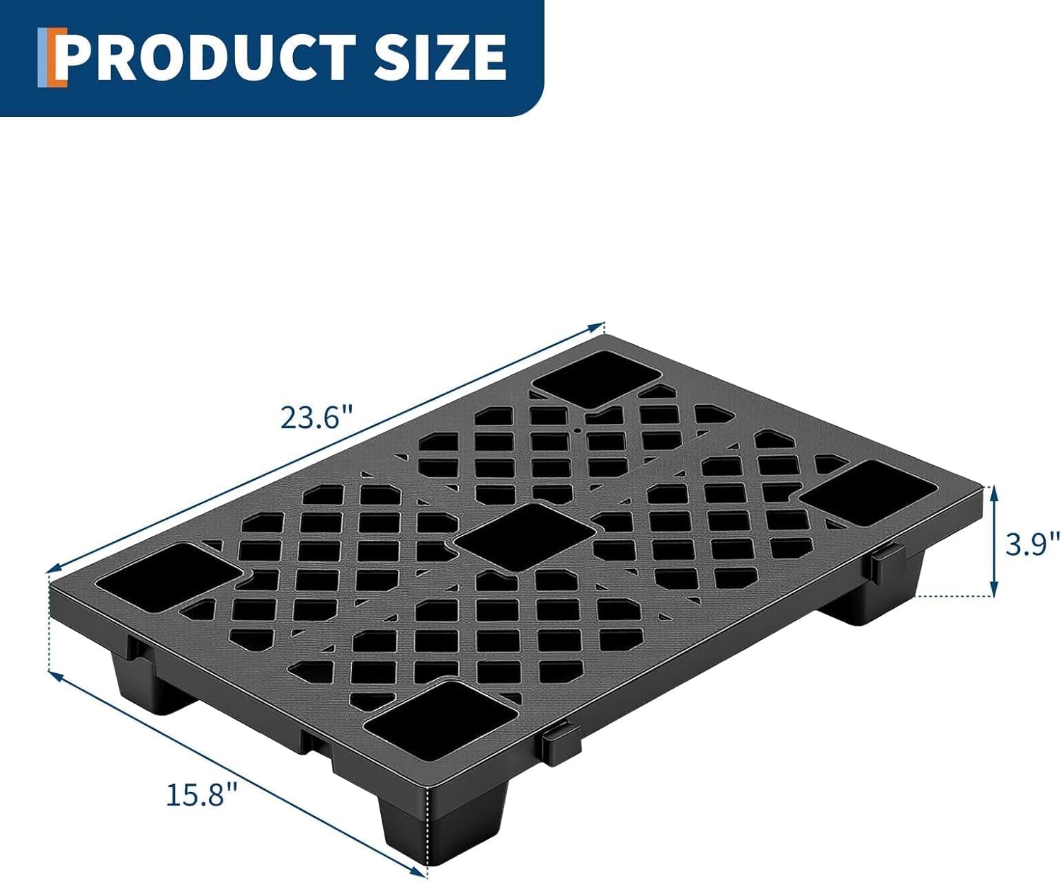 Specifications:Material: High-Density Polyethylene (HDPE)Load Capacity: 2200 lbs per palletDimensions (Each): 23.6" L x 15.7" W x 3.9" HDesign Features: Breathable Grid, Interlocking Edges, Nestable, Forklift CompatibleSurface: Anti-Slip TextureQuantity: 4/6/8 Pallets per SetUpgrade your storage strategy with the durable, adaptable designed for efficiency.