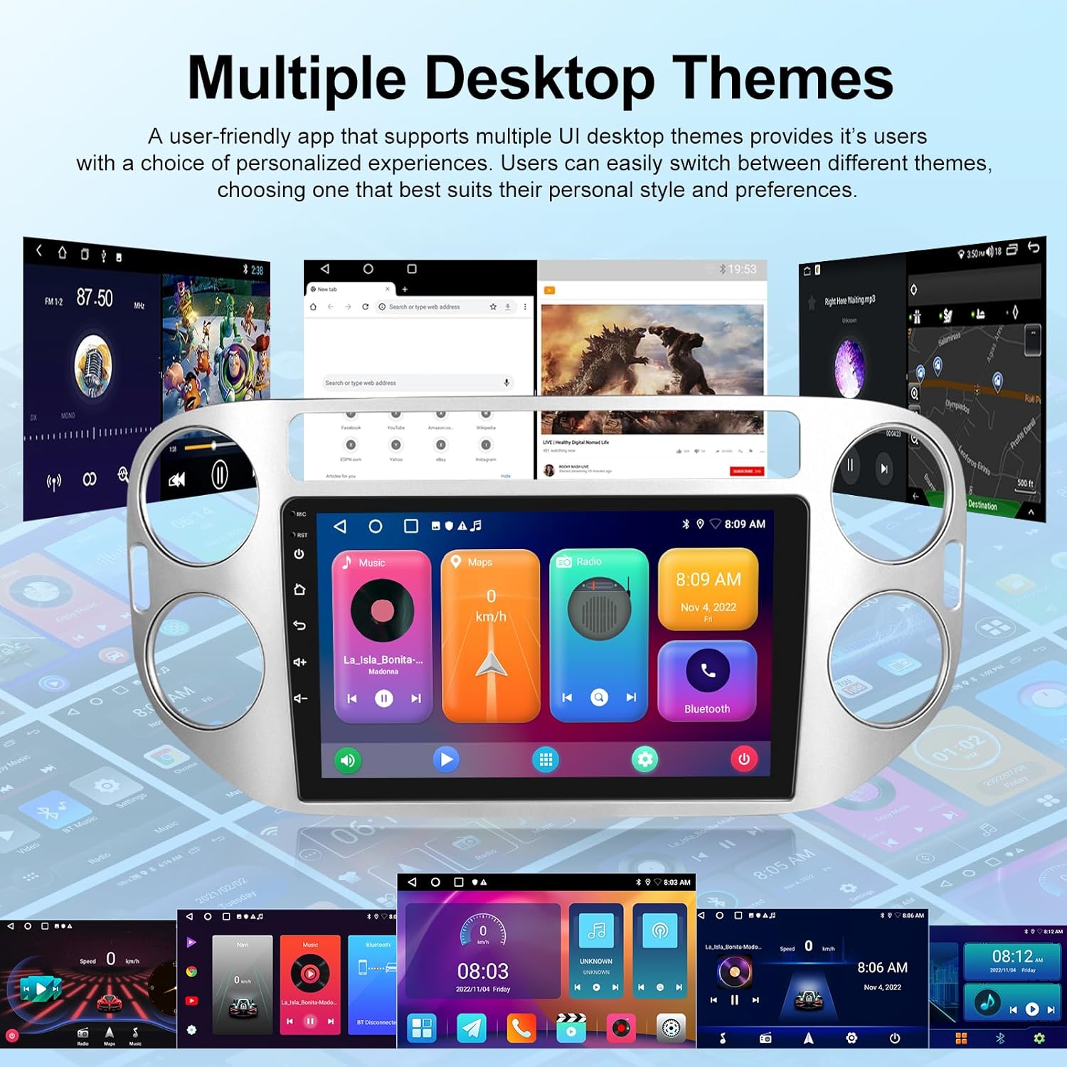 | Additional Features | 26 Multiple UI Desktop Themes, DSP Audio & FM/RDS Radio, Split Screen / 2.5D Screen, WiFi Connection & GPS Navigation, Wireless Carplay & Android Auto |