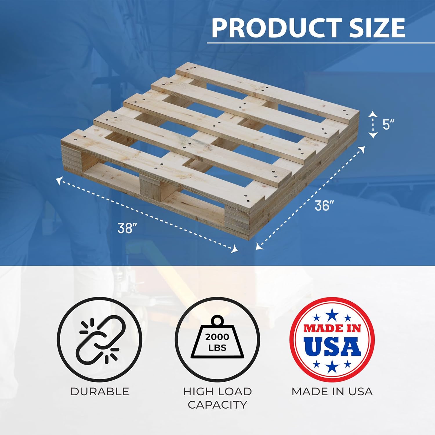 Upgrade your storage and shipping setup with this 38×36×5″ Industrial-Grade Wooden Pallet, designed for strength, versatility, and efficiency. Crafted from kiln-dried hardwood, this heavy-duty pallet supports up to 2,500 lbs of evenly distributed weight without warping or cracking—perfect for commercial, retail, and industrial environments.The 2-way entry design allows forklifts and pallet jacks to access the pallet from 2 side, streamlining warehouse operations and cutting down on handling time. With pre-built deck boards and bottom stringers, setup and stacking are quick and hassle-free, saving you on labor and installation costs.It is better than Plastic pallets because wood absorbs pressure, you can use as a basement flooring to storage goods, Pallet racking is most convenient way, you can also use as a outdoor platform, pallet bed, portable deck platform outside, store wood pallet for crafts,Its standard size fits most racking systems and is ideal for a wide range of uses including warehouses, shipping facilities, supermarkets, closets, basements, storage buildings, and garages. The natural wood finish is eco-friendly, reusable, and recyclable, making it a sustainable choice for long-term use.Sold as a single-piece set, it’s great for small batch needs, spot orders, or trial use—no minimum purchase required.