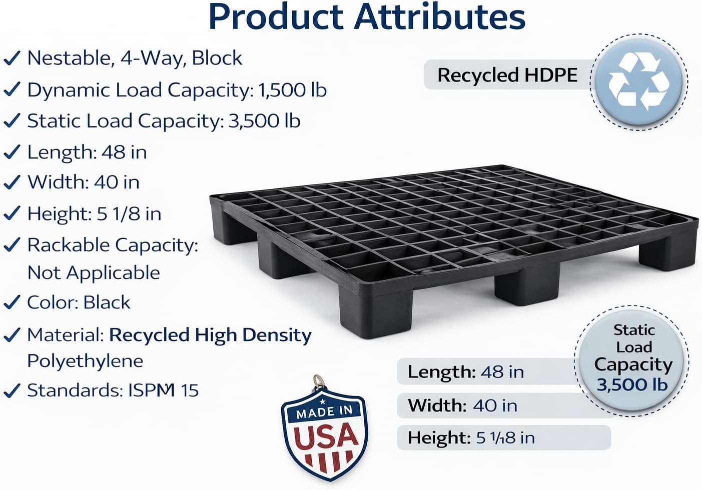 To make this description effective for Amazon, we need to balance technical specifications with real-world benefits. This layout uses clear headings and a professional tone to reassure industrial buyers while remaining accessible to home users. Heavy-Duty Industrial Solution: 3-Pack Made in USA Plastic Pallets Upgrade your storage and logistics with the ultimate heavy-duty pallet solution. Tired of splintering wood, protruding nails, and pallets that warp under pressure? Our 3-Pack of Heavy Duty 48" x 40" Plastic Pallets is engineered for maximum durability and environmental responsibility. Proudly Made in the USA, these pallets are the gold standard for warehouse management, home garage organization, and industrial shipping. Unmatched Strength & Engineering Each pallet in this set is rated for a 3,500 lb Static Weight Load Capacity. Built from high-density polyethylene (HDPE), these pallets provide a stable, rigid base for heavy machinery, bulk inventory, or long-term storage. The 5-inch low-profile height ensures they fit seamlessly into standard racking systems while maximizing your vertical storage space. Built to Last in Any Environment Unlike traditional wood pallets that absorb moisture, harbor pests, and decay over time, our Recycled HDPE construction is: Weather-Resistant: Ideal for outdoor storage or damp environments. Chemical-Resistant: Easy to sanitize and resistant to most oils and acids. Safety-First: No splinters, no nails, and no sharp edges to damage your goods or injure your team. Eco-Friendly & Sustainable We believe in high performance without the high environmental cost. These pallets are manufactured using 100% Recycled High-Density Polyethylene, diverting plastic from landfills and turning it into a long-cycle industrial tool. When you choose these pallets, you are investing in a sustainable circular economy. Specifications at a Glance: Quantity: 3-Pack Bundle Dimensions: 48" L x 40" W x 5" H (Standard Universal Size) Material: 100% Recycled HDPE (High-Density Polyethylene) Load Capacity: 3,500 lbs (Static) Entry Type: 4-Way Entry for easy Forklift and Pallet Jack access Origin: Made in the USA Perfect for: Warehouses, automotive shops, food & beverage storage, pharmaceutical clean rooms, and heavy-duty home garage organization.