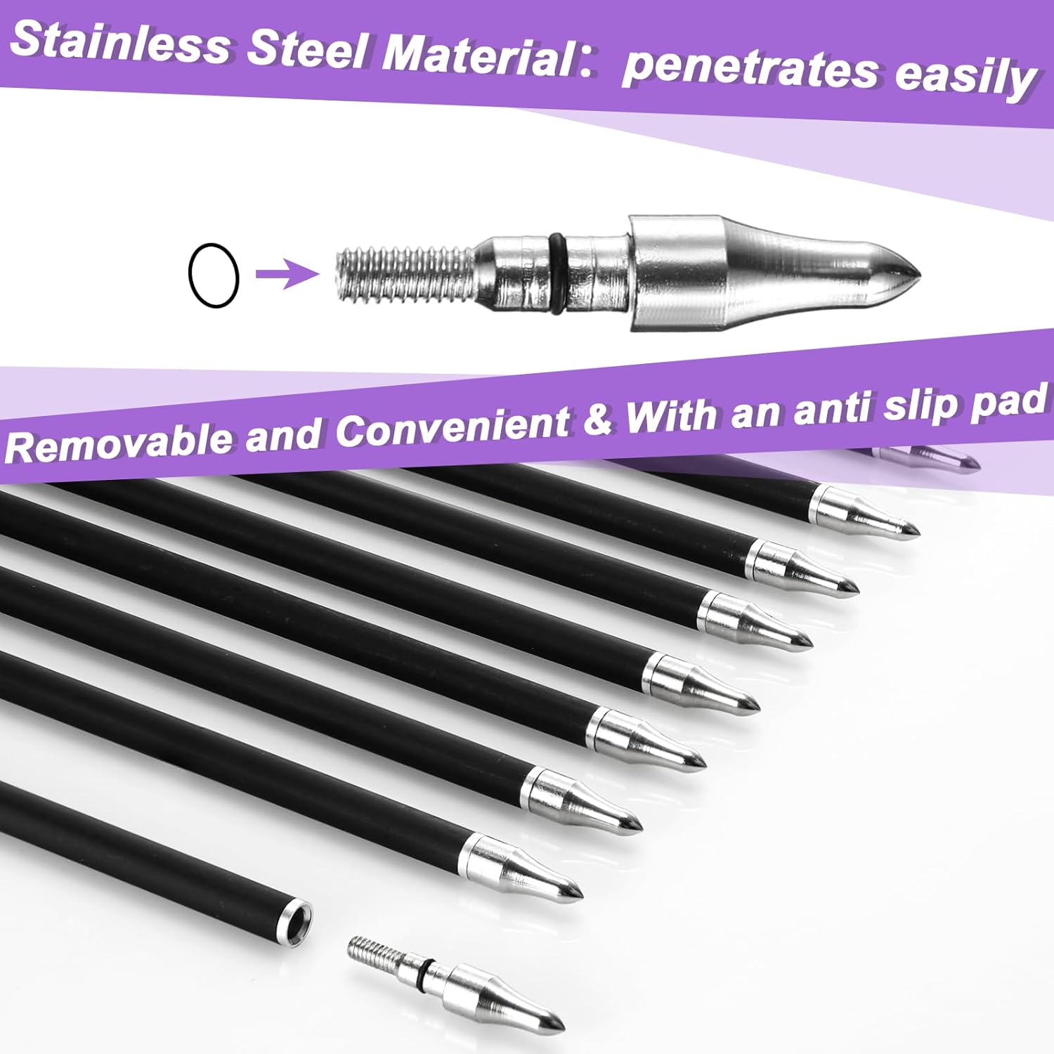 Features: Practice arrows for recurve bow, compound bow, or long bow are an ideal choice of present for archery enthusiasts in your life. Not only do they serve a practical purpose, but their quality construction and attention to detail artifacts are appealing. Arrows for hunting can be effectively applied for recurve, compound, or long bows. This makes them versatile and practical for many archery activities, be it hunting or target shooting. These arrows ensure an enjoyable archery experience for both beginners and experts alike. Specifications: Material: mix carbon for arrows, glue feather, stainless steel for the tipMain color: purple whiteSize: Shaft length: about 30 inches/ 76.2 cmFull arrow length: about 31.5 inches/ 80 cmOuter diameter: about 0.31 inch/ 7.8 mmFeather length: about 3 inches/ 7.6 cmSpine: 500-600For draw weight 30-60 lbs recurve, compound, or long bowsWeight: about 35g eachPackage includes: 24 x Hunting arrowsNotes: Manual measurement, please allow slight errors on size. The color may exist a slight difference due to different screen displays. Pointed items are included, please be careful when using, and please keep them away from little ones.