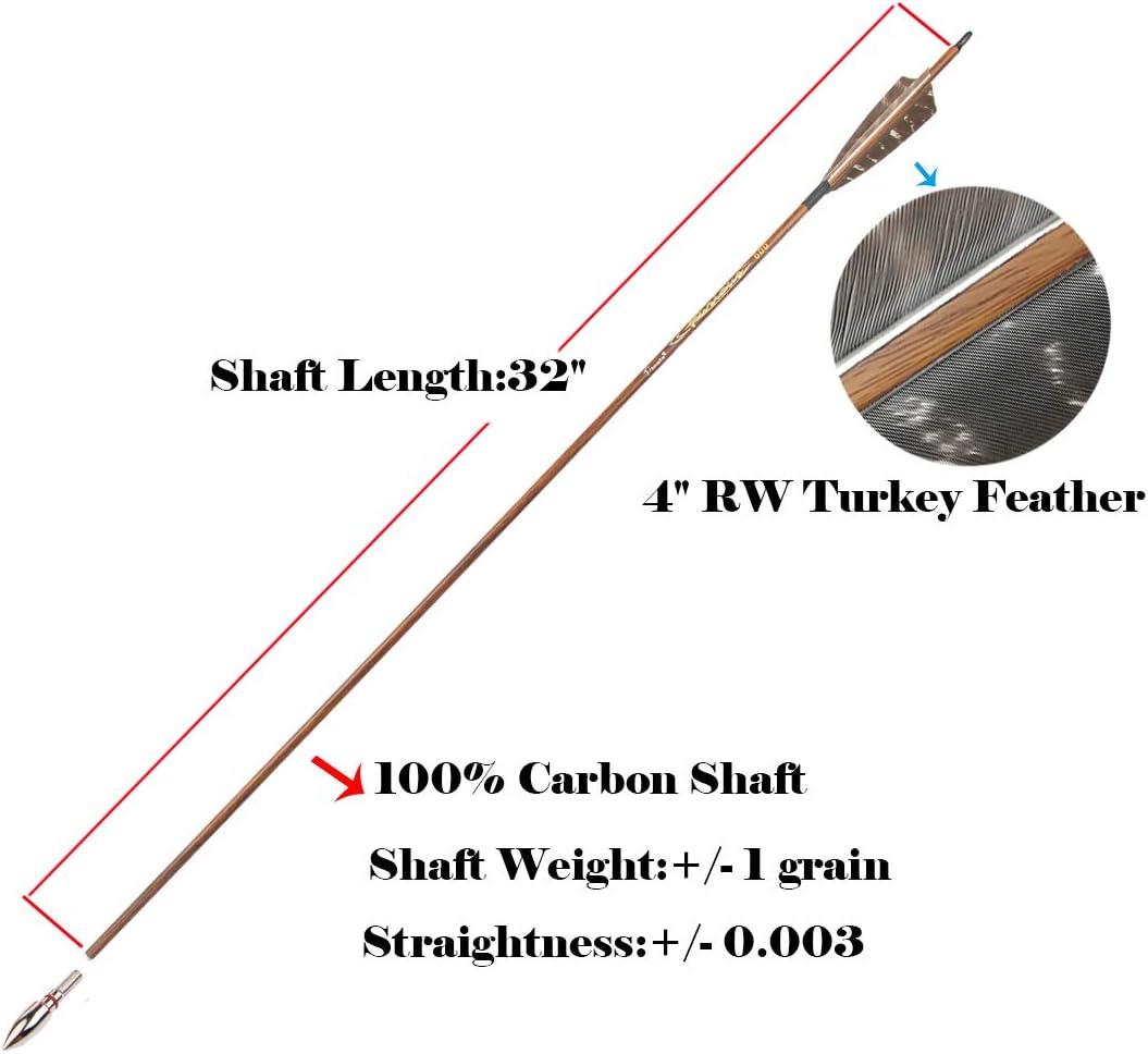 Arrows Specification: Brands:Pinals Archery Shaft Straightness:+/-0.003 Shaft Material: Pure Carbon Shaft Diameter:ID 6.2mm(.244) Spine:300 400 500 600 Arrow fletches: 4 inch right wing turkey feather Arrow Points: 100 grain Arrow nocks: adjustable nocks, not fixed by glue Shaft Length: 30 or 32 inches (Includ 12pcs replacement aluminum insert,you can use it after cutting the shaft length) Usage: Perfect for Recurve Compound Bows and Longbows; Can be used for archery practice, competition and outdoor hunting Package Included: 12PCS Arrows 12PCS Replacement aluminum insert Note: 1. Please do not shoot at anybody, this is not a toy. 2.If you have any questions, please feel free do not hesitate to contact us,we try our best to help you solve it