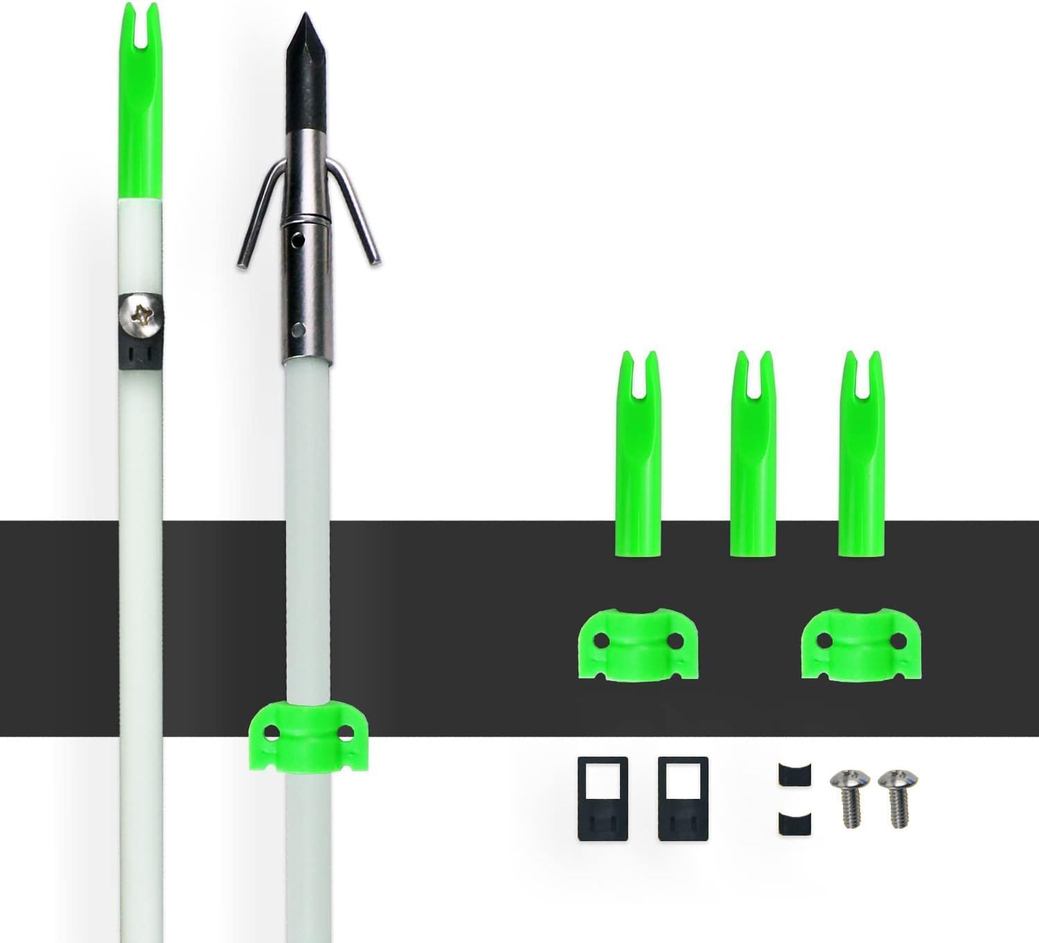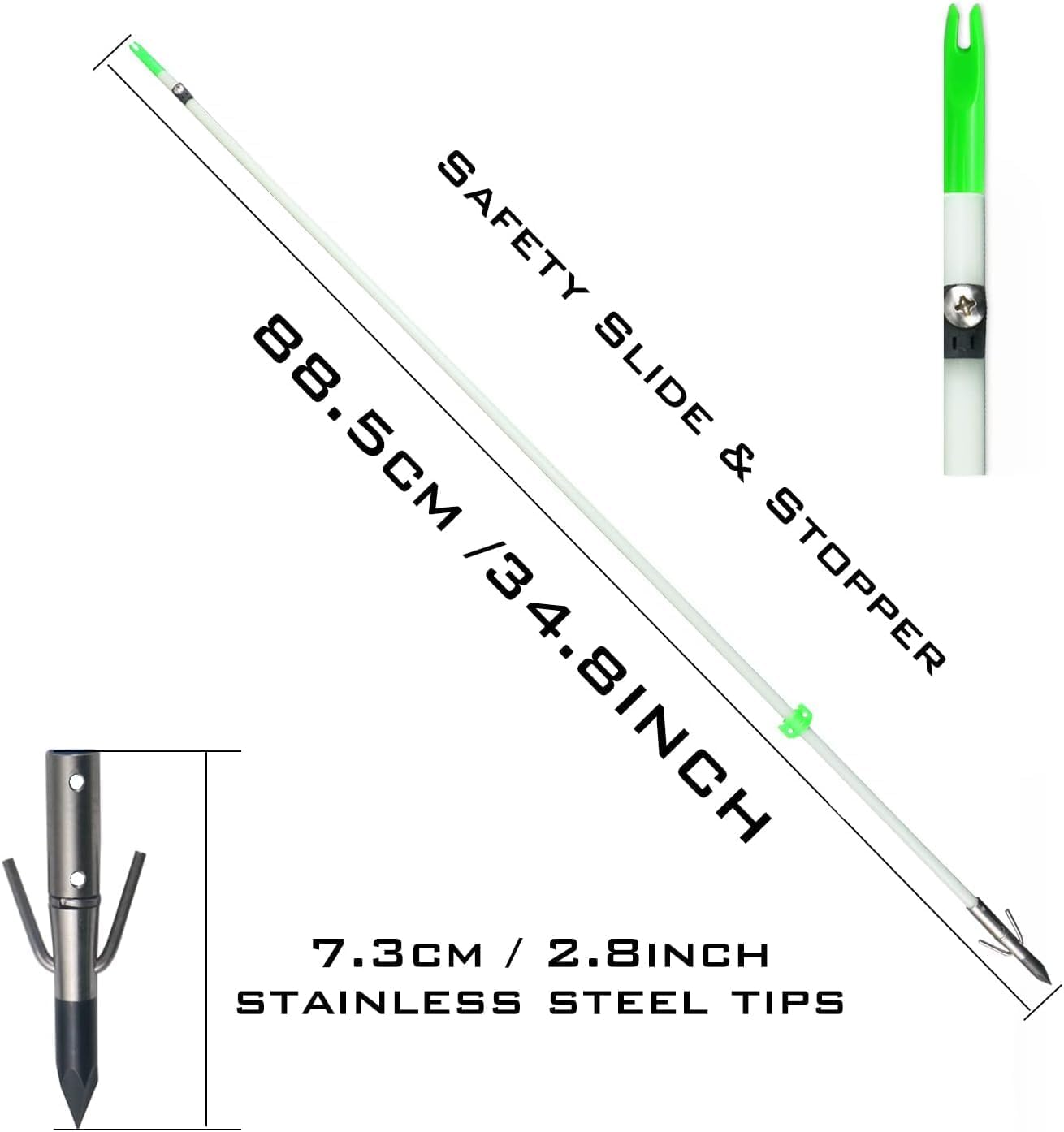 Bowsoul Professional Bowfishing Arrows For A Better Archery Experience.The solid and high qualityarrow shafts built to Never Break Easily! Glow-in-the-dark shafts make arrows easier to spot atnight, adding to thenighttime fish shooting experience, Fluorescent arrow nocks and sliders that only need light to glow at night.8mm Bowfishing ArrowsArrow Length: 34.8inch in totalArrow Shaft OD: 8mmArrow Weight: 100gColor: White Arrow Tips: Stainless steel arrowhead andcan be removed.Condition: New itemSafety: High quality slider and stoppermake bowfshing safer,We have a setof accessories as a gift,which can save your cost and they can be replaced easily.Package include6 pieces of Bowfishing Arrows,3 Pieces nocks and 1 set of accessory.