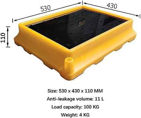 We present our versatile garage rack pallet, designed to optimize your storage options. Made from robust, high-quality plastic, this pallet offers a reliable solution for protecting your belongings. The rounded corners enhance stability, making it pressure-resistant and ideal for heavy loads. Whether you're organizing your basement, storing food, toys, warehouse supplies, or supermarket goods, our pallets provide a practical solution. They can be easily combined to create customized storage configurations that meet your specific needs, increasing efficiency and convenience. Specifications: - Product Name: Spill Conduit Tray - Material: High-quality plastic - Color: Yellow and black - Available Sizes: - 675 x 375 x 120 mm: Leak-proof volume: 25 l, Load capacity: 200 kg, Weight: 3.5 kg - 675 x 675 x 120 mm: Leak-proof volume: 40 l, Load capacity: 300 kg, Weight: 7 kg - 530 x 430 x 110 mm: Leak-proof volume: 11 l, Load capacity: 100 kg, Weight: 4 kg - 670 x 670 x 150 mm: Leak-proof volume: 43 l, Load capacity: 680 kg, Weight: 8 kg Key Features: - Leak-proof design to protect against spills - Non-slip surface for increased safety - Robust construction for reliable support Ventilation design to reduce moisture build-up – Wear-resistant for long-term use – High load-bearing capacity, suitable for a wide variety of goods. Please note: We only sell the drip tray; the items shown are for illustrative purposes only. Optimize your storage solutions with our reliable garage rack system and experience greater organization and efficiency today!