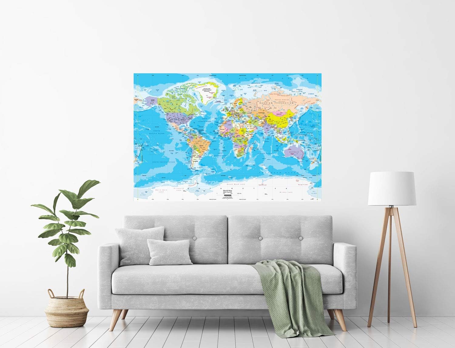 BEAUTIFUL POLITICAL WORLD MAP with updated country, city, and place names. Countries are presented in bright, contrasting colors. It adds character, charm, and an educational flavor to any living room, study, office, or kid's room. People who like watching the news or keep up on current events love this map as does anyone with an appreciation for inspiring art. You will find yourself returning to is over and over to recharge your energy, good mood, and ideas. The map is self sticking requiring no tape, nails, or glue. Simply peel and stick. It's easy to reposition or remove. It will not mark or leave residue on walls. PRODUCT FEATURES: Political World Map Mural Peel and stick, easy application Simple to reposition or remove from wall Will not harm walls or leave sticky residue Features a classic blue ocean world map color theme Adds a pop of color to any interior space Choose from a variety of sizes available Durable materials with quality printing will last and look good for years MADE IN THE USA in small batches to ensure top quality product. Many people love this map so much they return to buy another to give as a gift. Get yours today!
