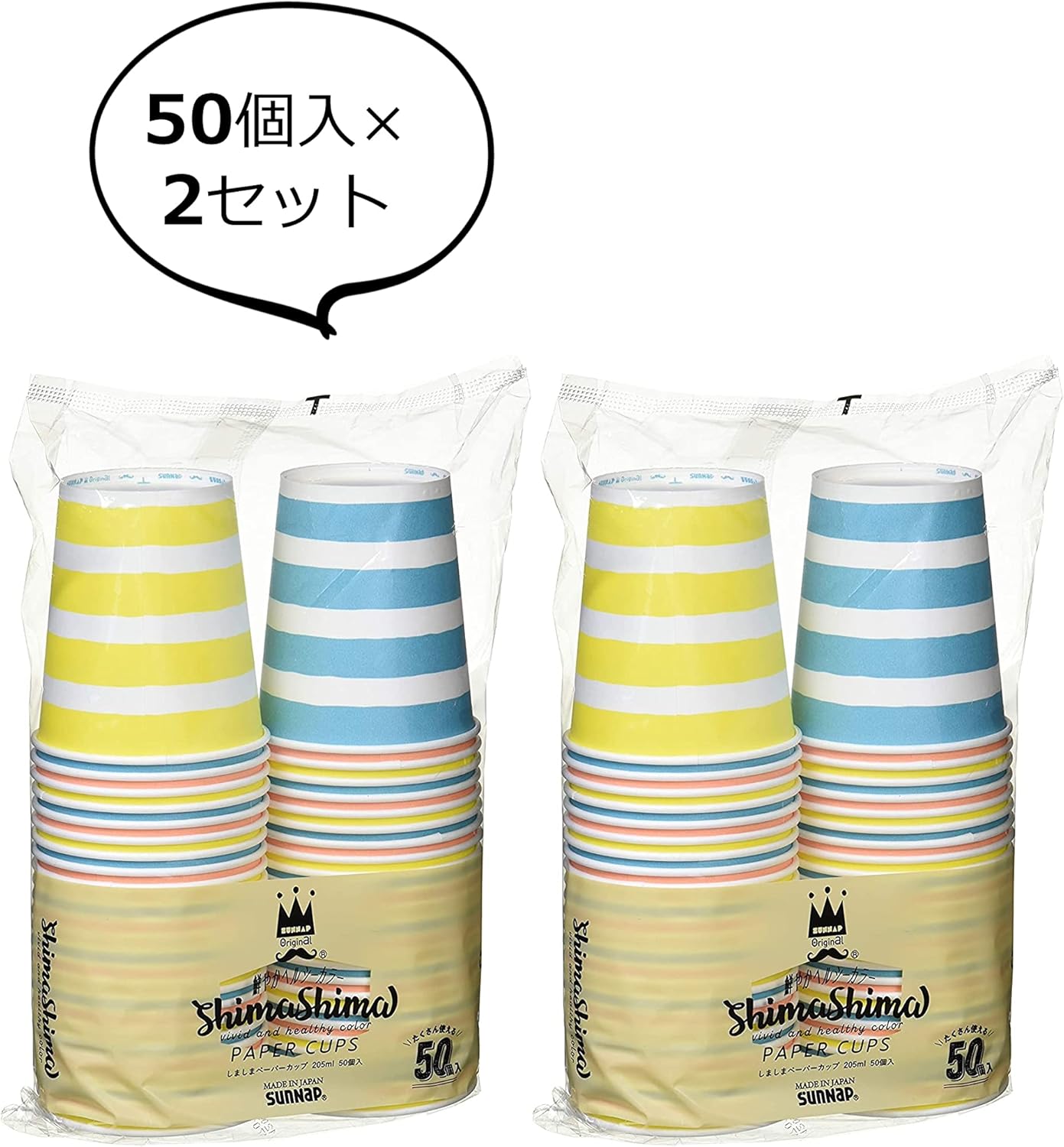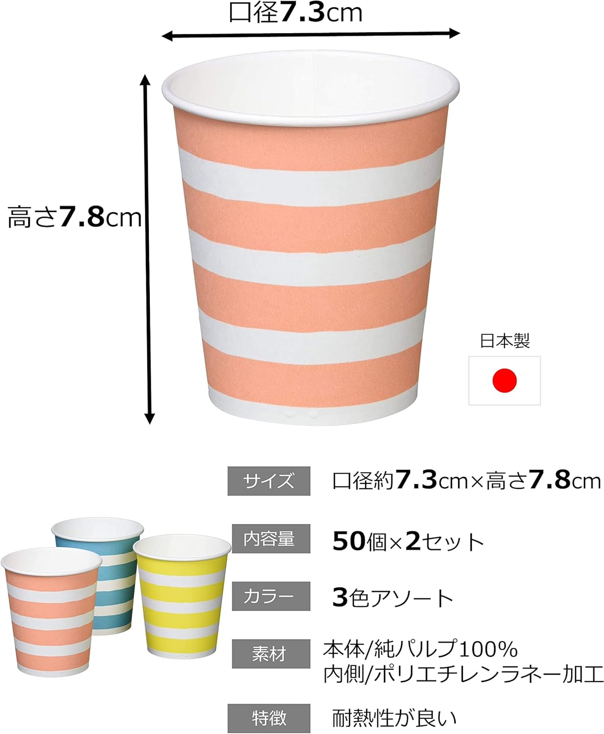 The color of the paper cups with yellow, pink and blue stash lines. Made in Japan with 100% pure pulp. A simple drink cup for hot and cold beverages. For coffee, tea, juice, cola, etc. For large customers at parties, festivals, school festivals, or at the stove ● Alcoholic beverages may become molle When filled with cold beverages, condensation will soften the cup, but this is not a leaky drink.