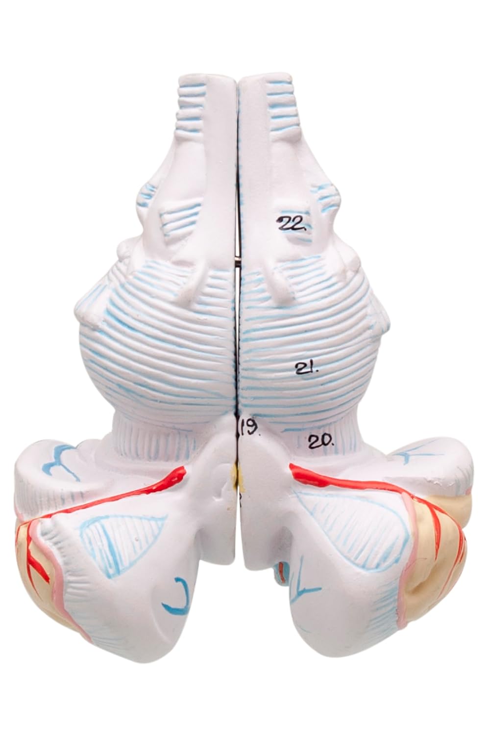 This beautiful, hand painted, life size model of the human brain separates into 8 parts so that students can learn visually about the basic anatomy of our most complex organ. Included, you will find a detailed keycard that corresponds to the 45 numbers on the model itself. The model is divided to show the temporal and occipital lobes, brain stem, cerebellum and the basiler artery. Blood vessels are visible across the entire model. Comes in a convenient stand for mounting and display.
